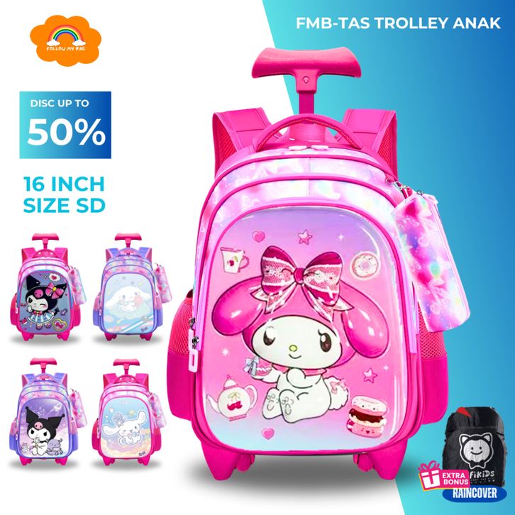 Tas troli anak perempuan FMB Troli Sekolah Anak Perempuan SD High Quality Gambar Timbul 3 Tas Koper Roda Anak Karakter