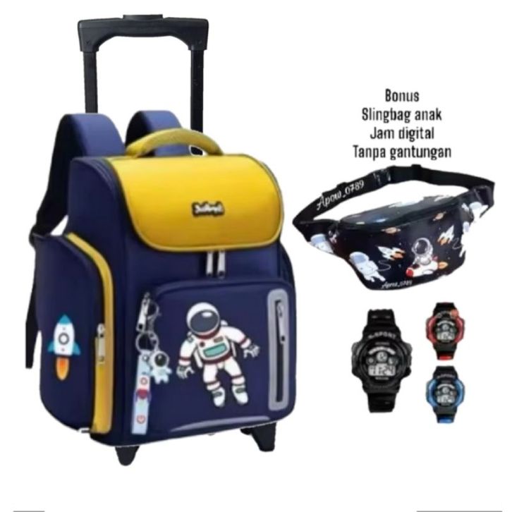 Tas troli anak laki laki Tas Ransel Troli Anak Sekolah motif astronot gratis jam Tangan / tas roda astronot Tabung ada
