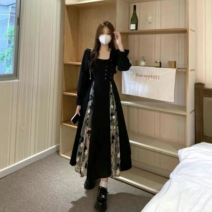 Dres Korea Gaun Retro Renda Bunga Hitam Squer Neck Dress maxi long dress - G039