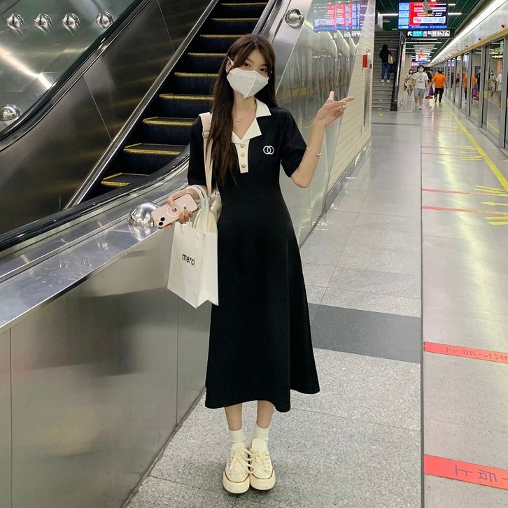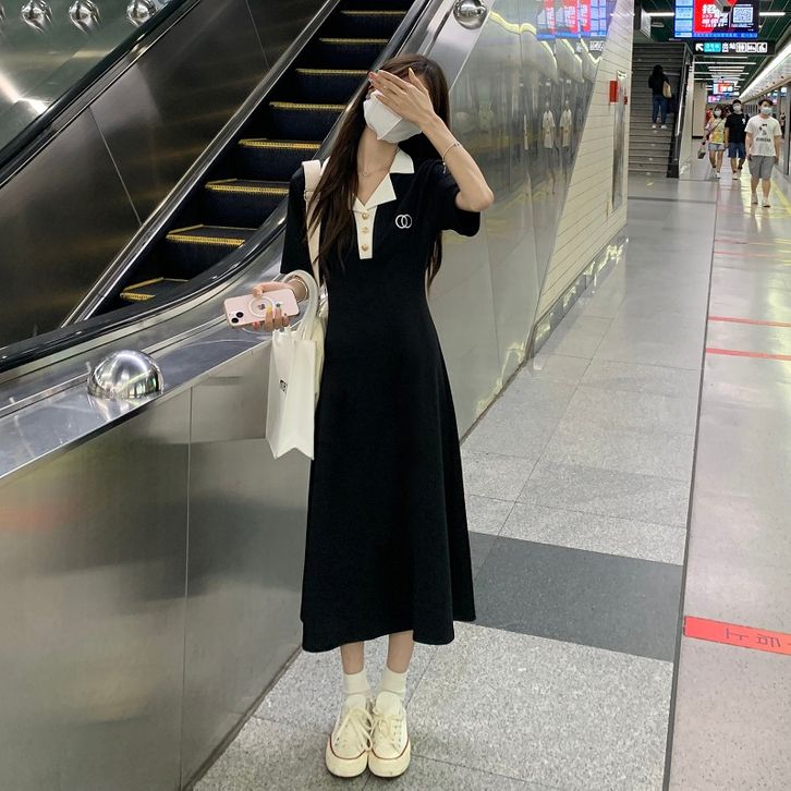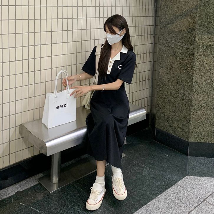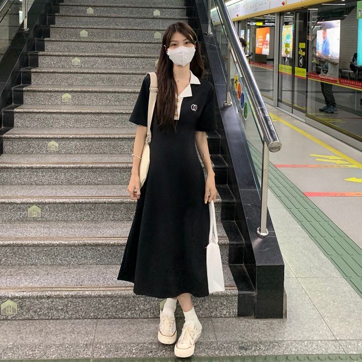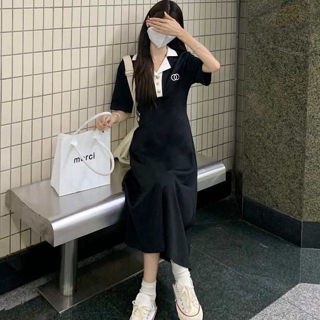 Dres Korea 【MOOGU】 Maxi Dress Korea Gaun Panjang Leher Polo Wanita Dres