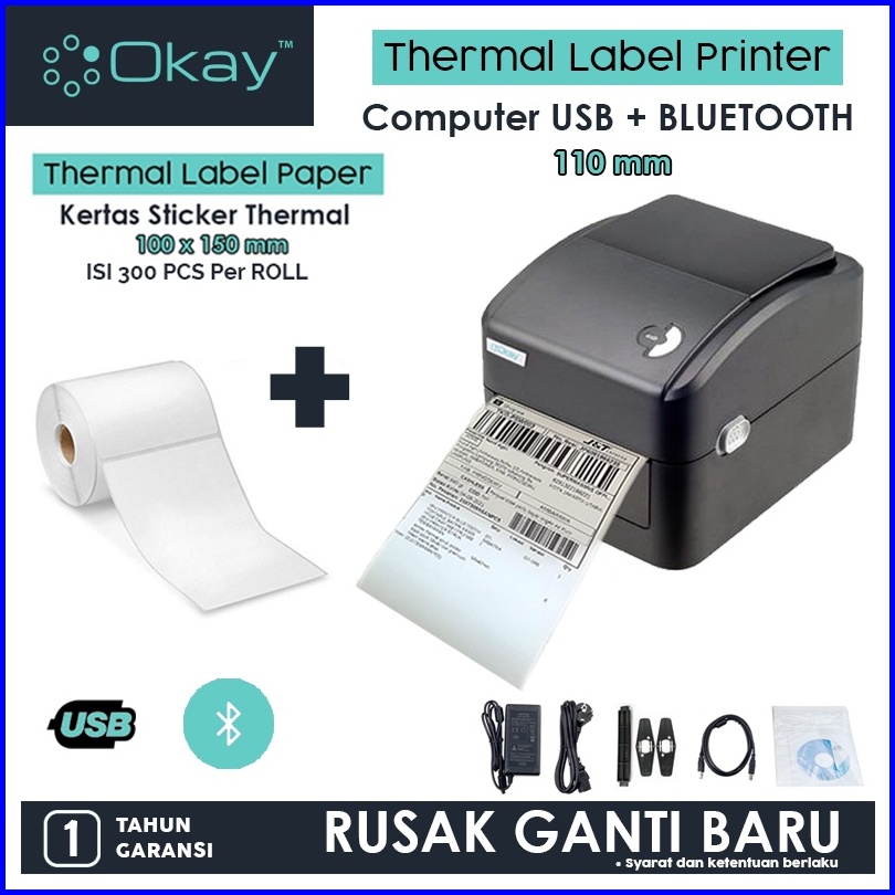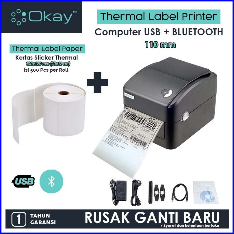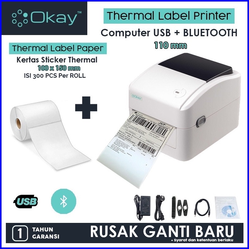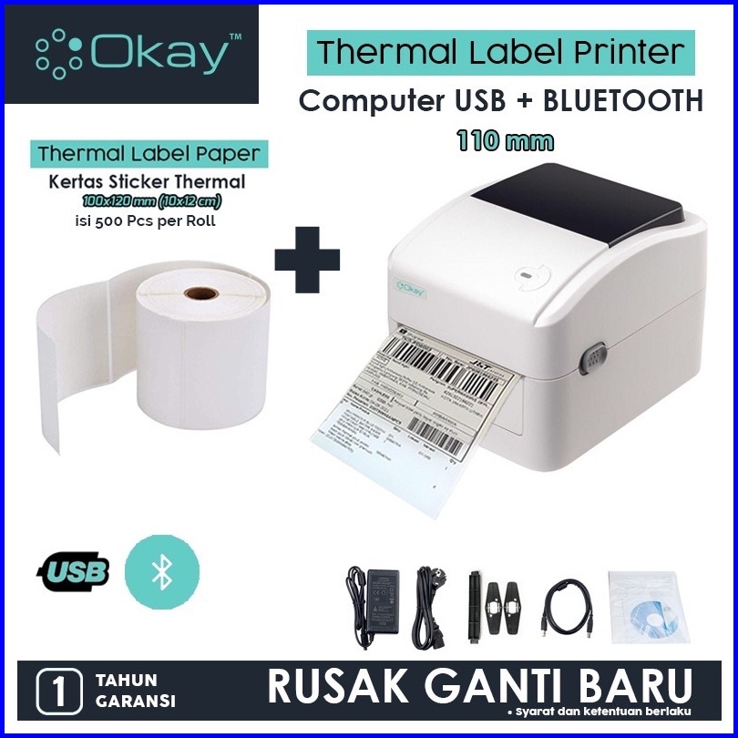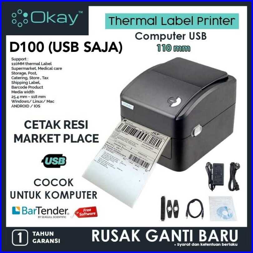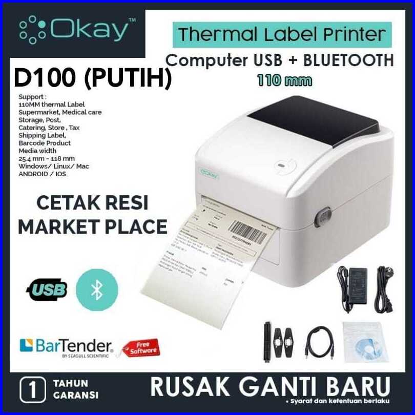 Okay D100 Bw Bl Printer Label Pengiriman Barcode Thermal Max Sticker A6 110mm Printer Resi