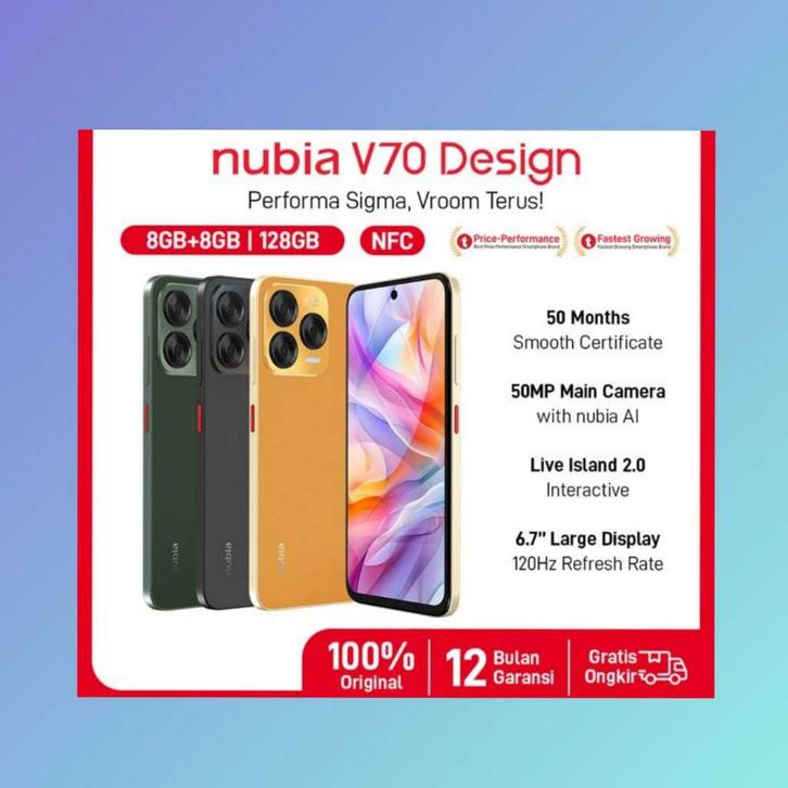 nubia V70 Design NFC RAM 8GB+8GB ROM 128GB 5.000 mAh 33W Fast Charging 50MP AI Triple Camera Sleek Slim Body Garansi Re