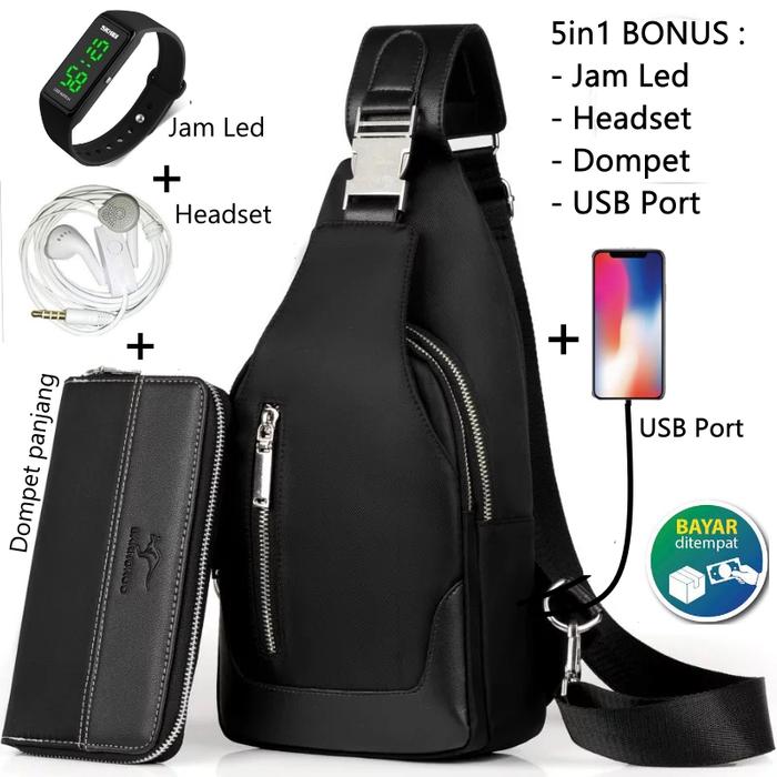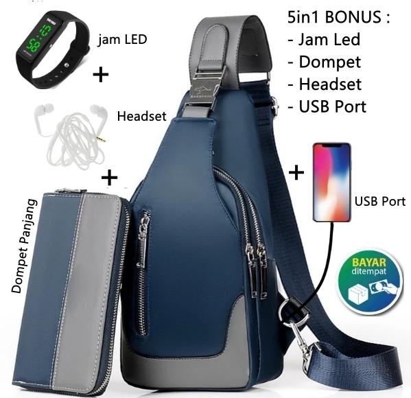 Tas selempang pria premium 5IN1 dompet panjang jam headset kabel usb/5in