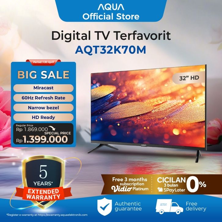 AQUA Elektronik TV 32 Inch AQT32K70M - Miracast - HD Ready - Auto Volume Leveler - USB Movie - Narrow Bezel
