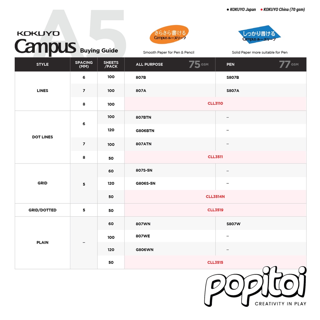 KOKUYO Campus Paper Loose Leaf Refill A5 50 100 Kertas Isi Ulang Binder