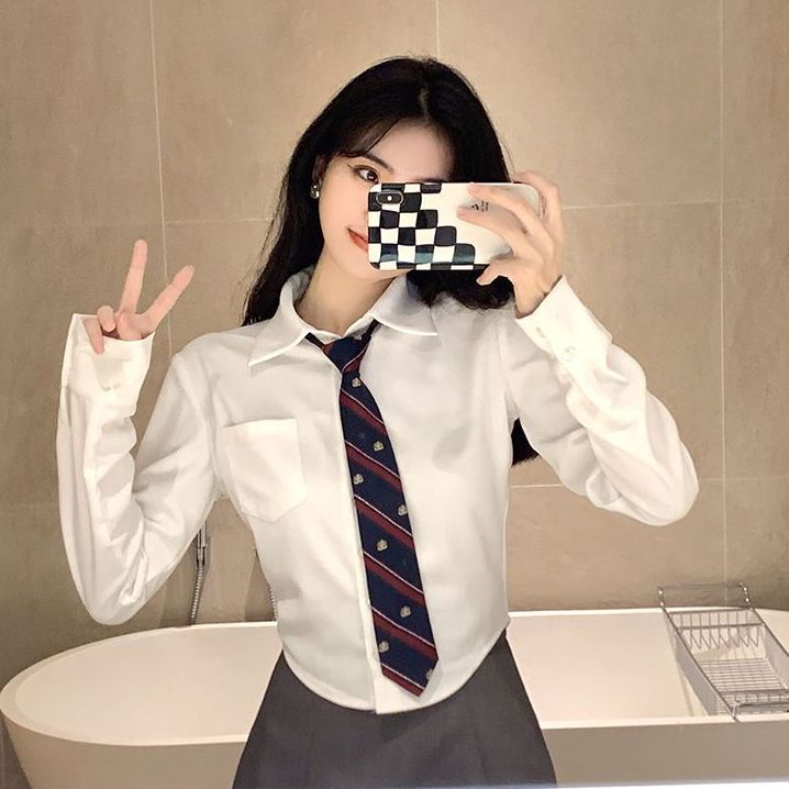 Kemeja lengan panjang gaya Korea baru warna solid serbaguna putih atasan kerja ramping