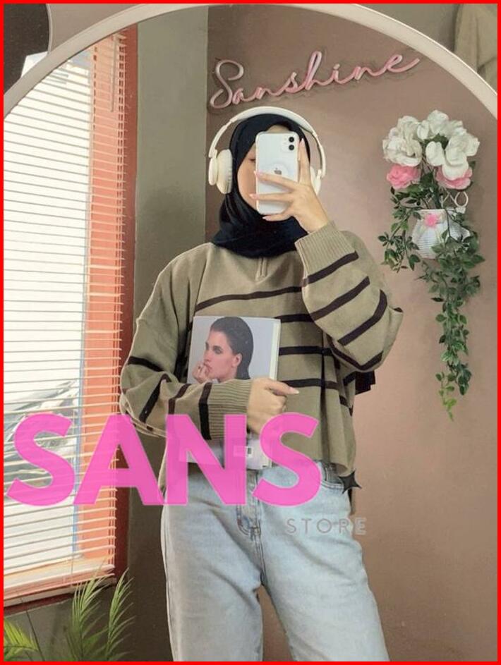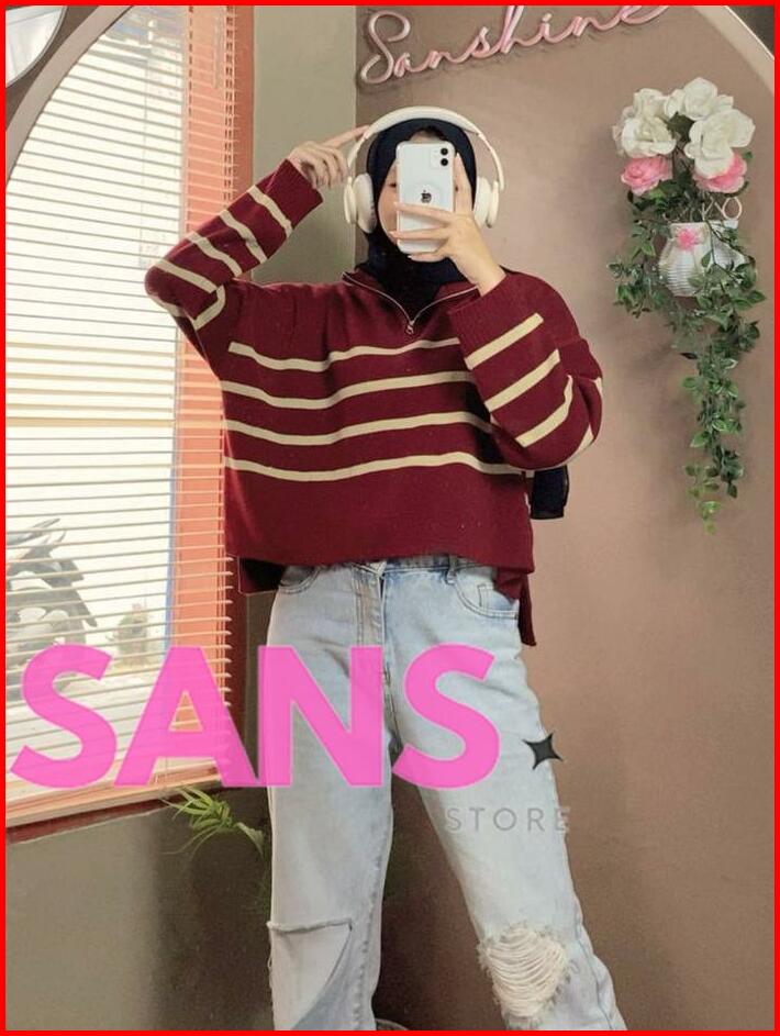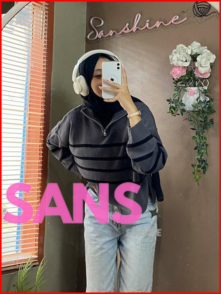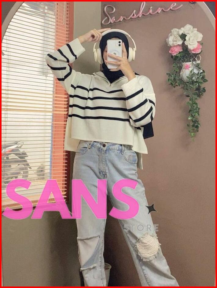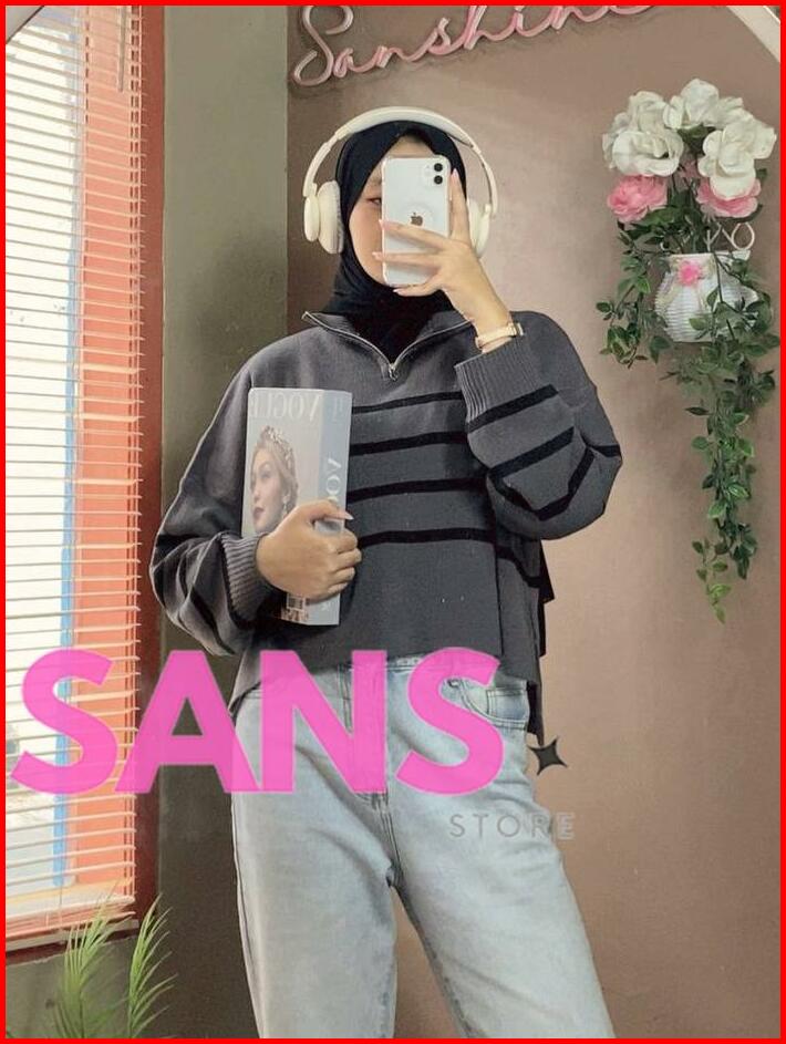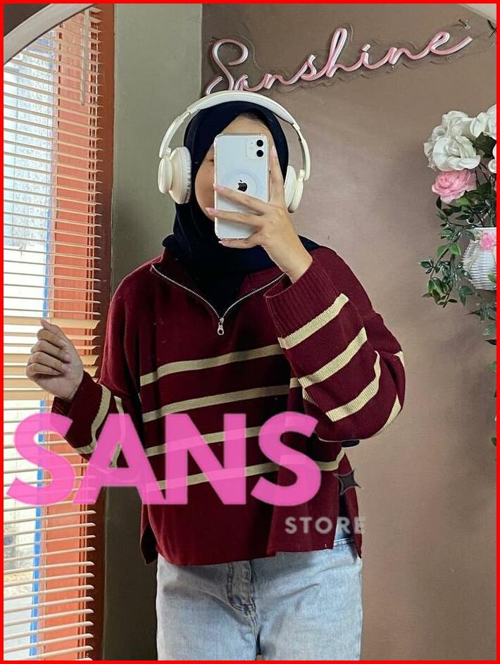 Zipzip Sweater Knit Zipper Striped Crop Premium Oversize Atasan Rajut Wanita Resleting Motif Belang Knitwear Top Sweater