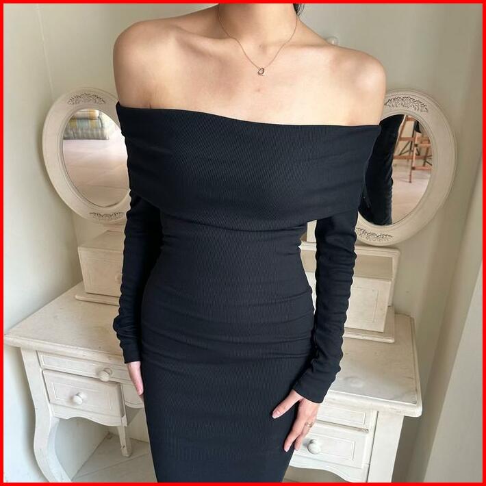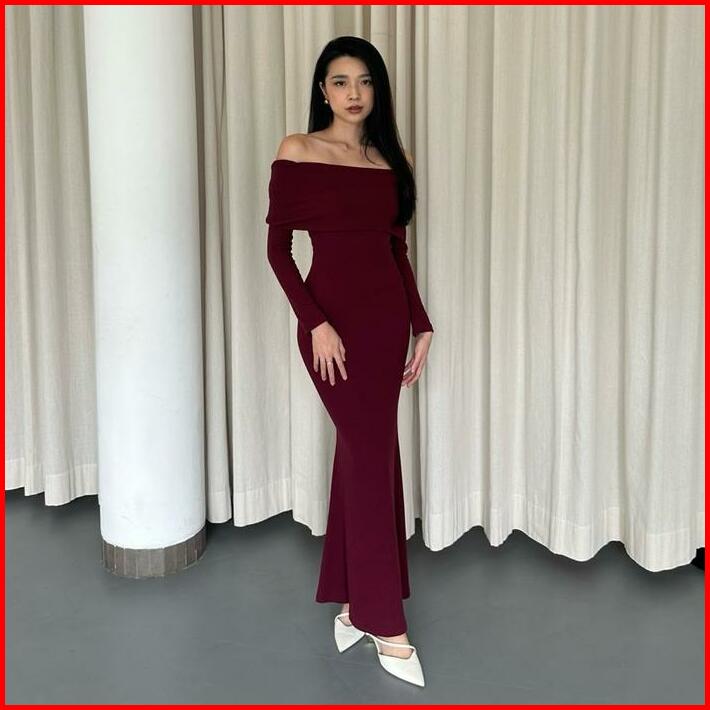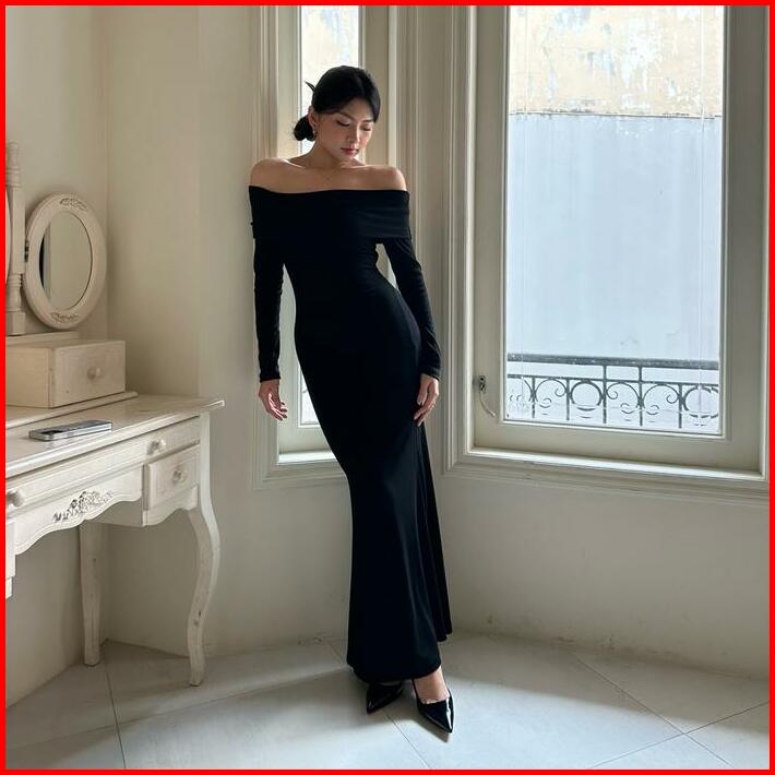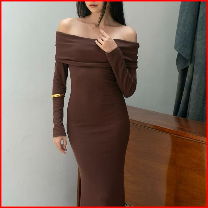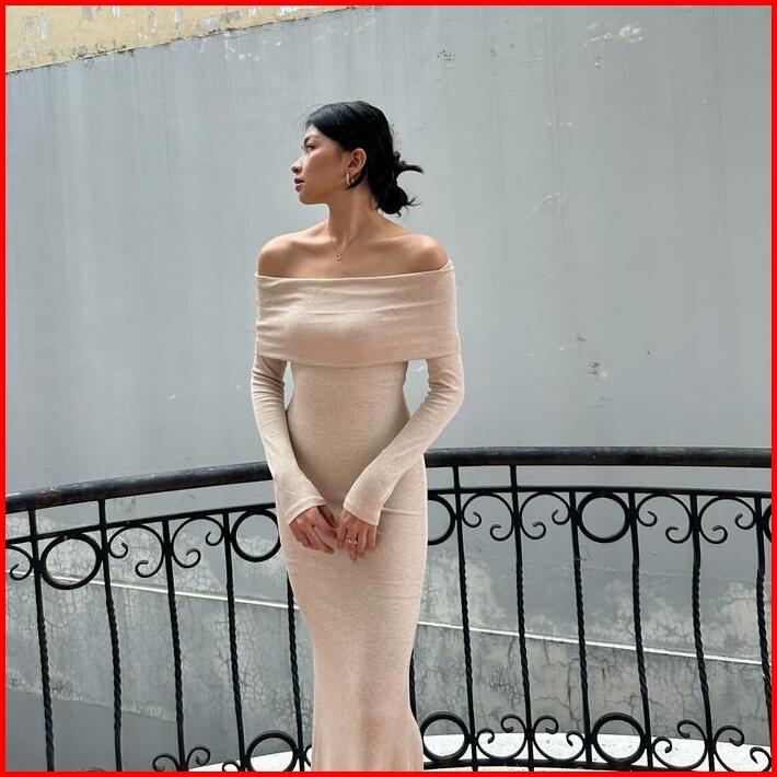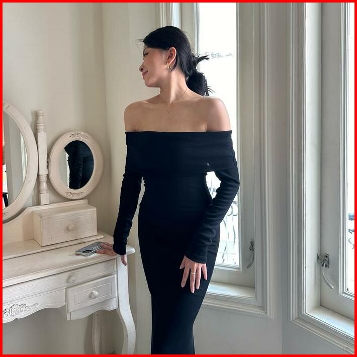 Sophia Dress Rooha Dress Panjang Wanita Off Shoulder Ribbed Knit Terusan Tangan Panjang Maxi Sabrina Dress Korean Long D