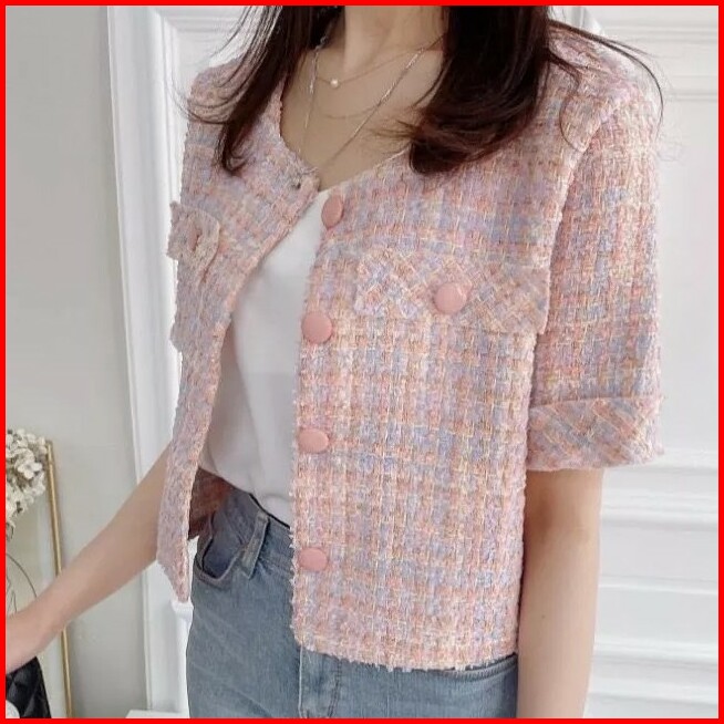 Outer Blouse Blazer Tweed Pastel Buttoned Casual Korean Style Vintage Import Top