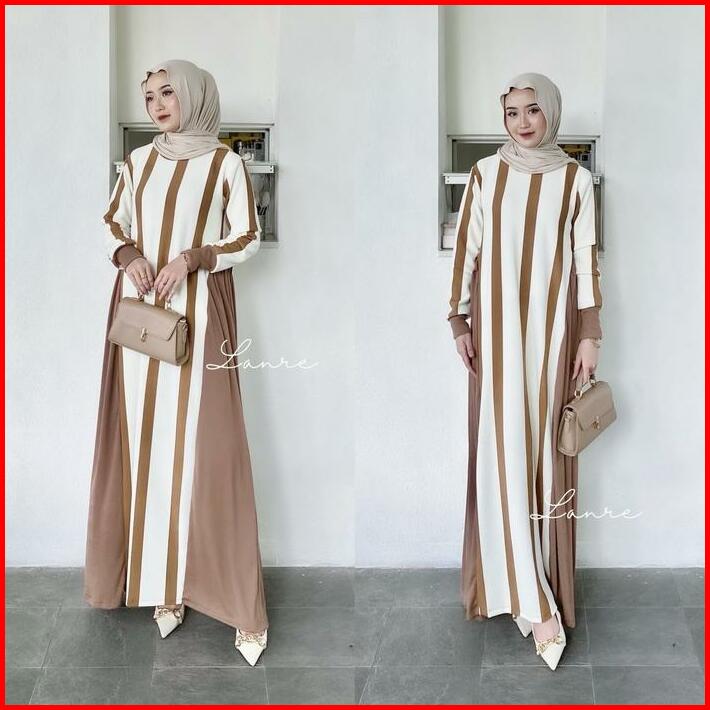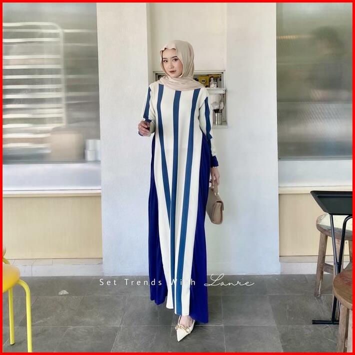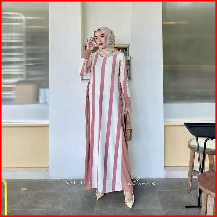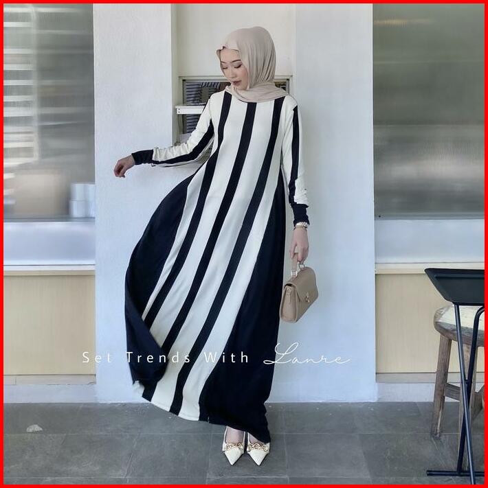Vina Dress Salur Garis Elegan Bahan Knit Gamis Cantik Wanita Muslimah Formal Lembut Motif Nyaman