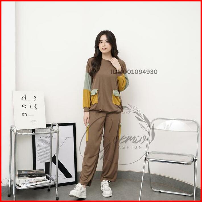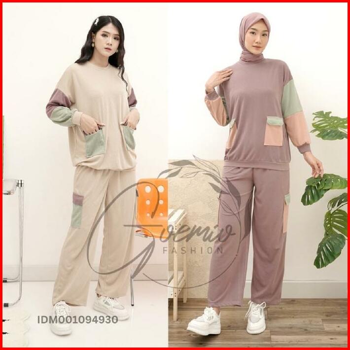 Bless Ld 120 One Set Malta Setelan Katun Knit Combi Atasan Garis Dan Celana Panjang Wanita Polos Lengan Panjang