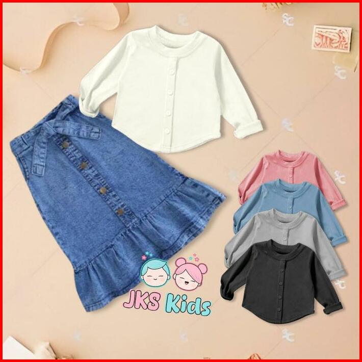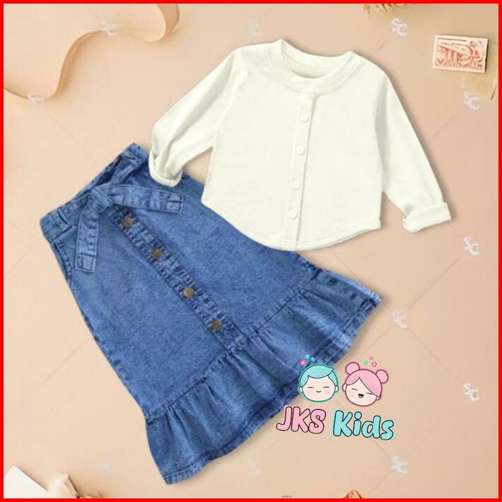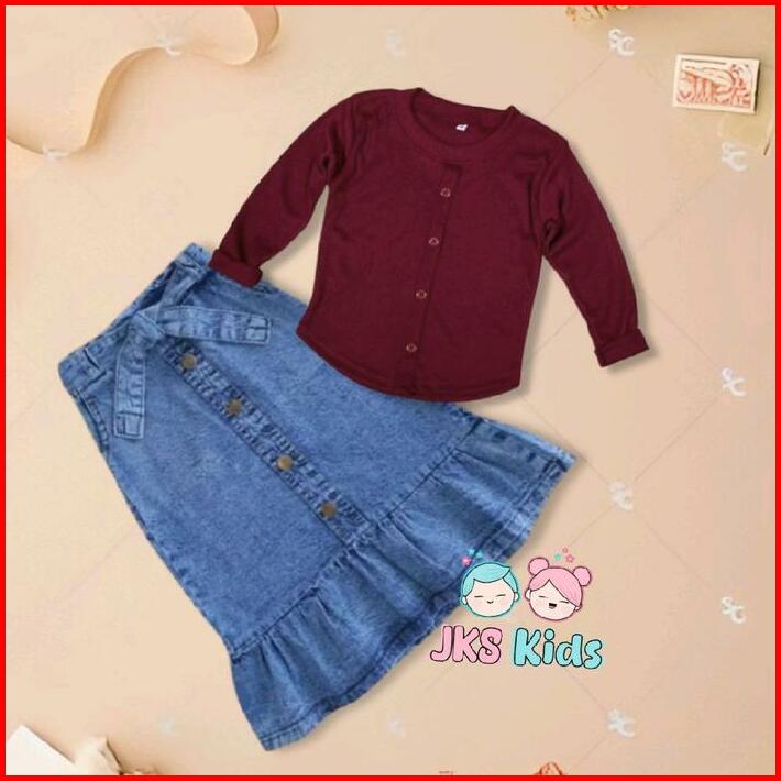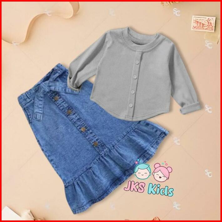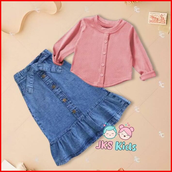 Setelan Rok Jeans Tali Atasan Knit Lengan Panjang Anak Perempuan