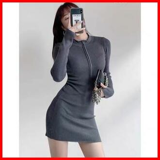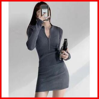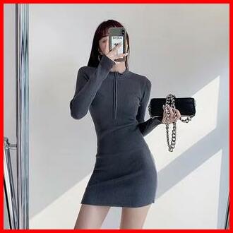 Premium Short Dress Knit Zip Long Sleeve Bodycon 7317 S M L