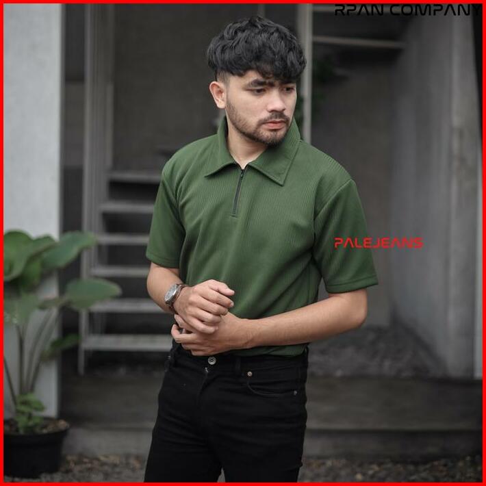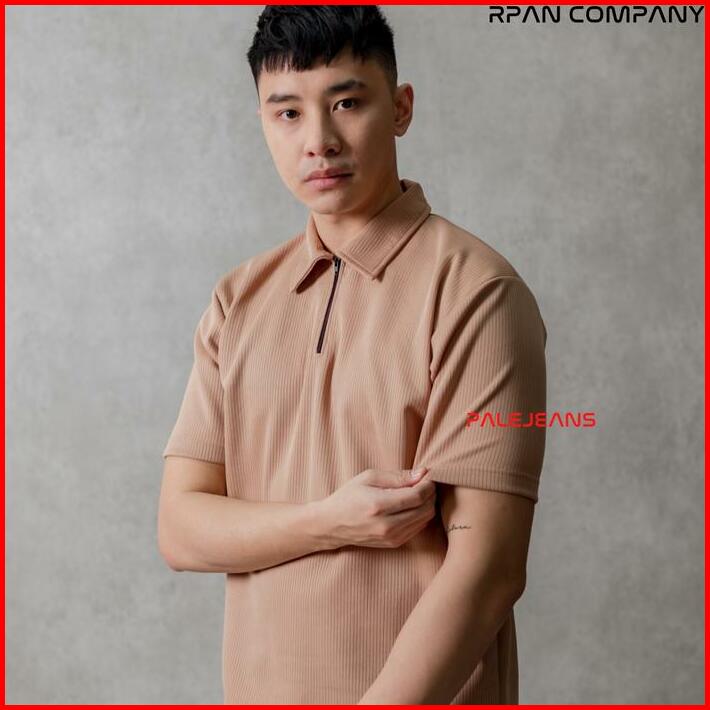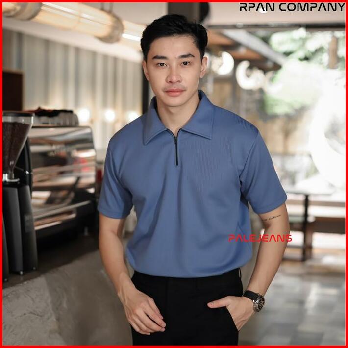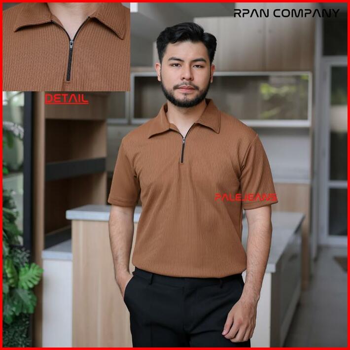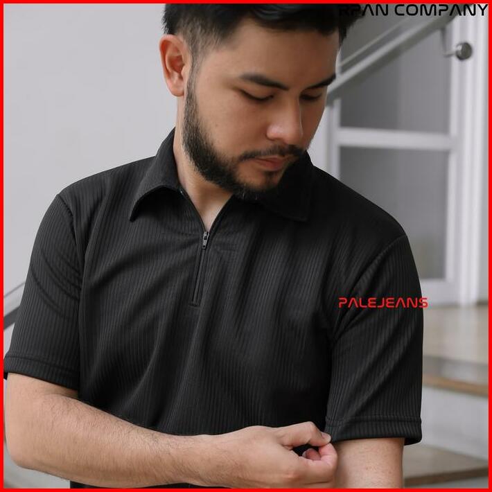 Polo Shirt Knit Motif Salur Kecil Zipper Pria Baju Korean Knit Kerah Resleting Garis Kecil Cutting Slim Fit.