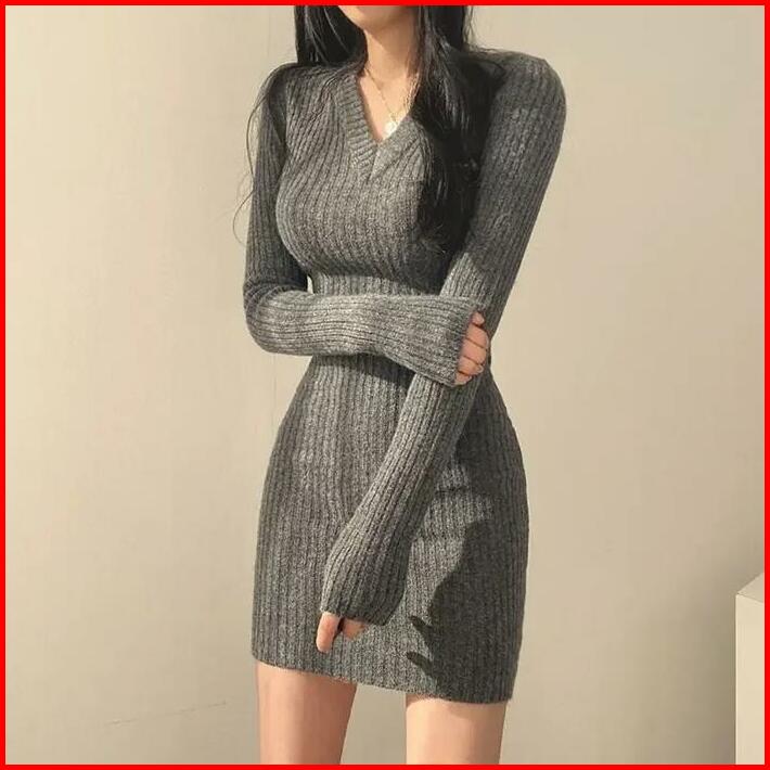 Sui Dress Rajut Knit V-neck Polos Lengan Panjang