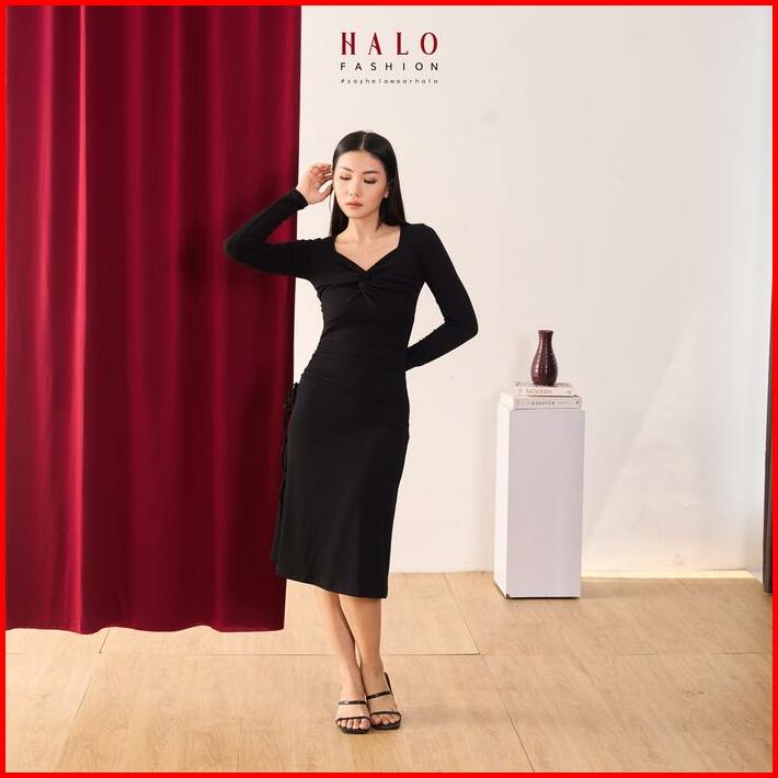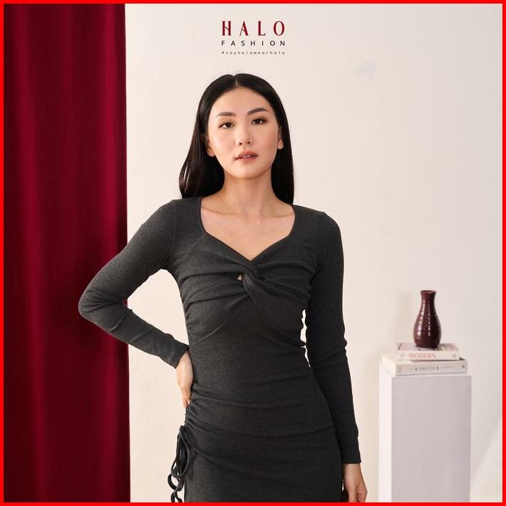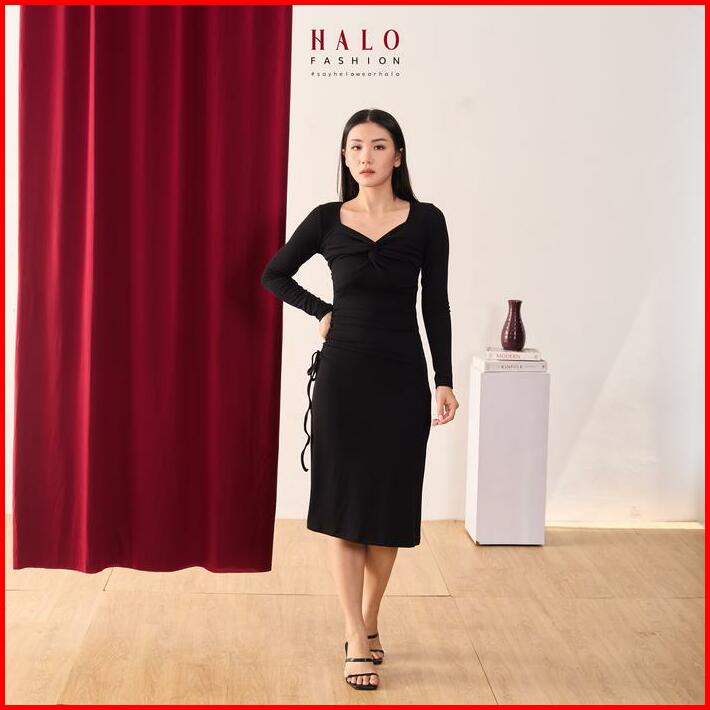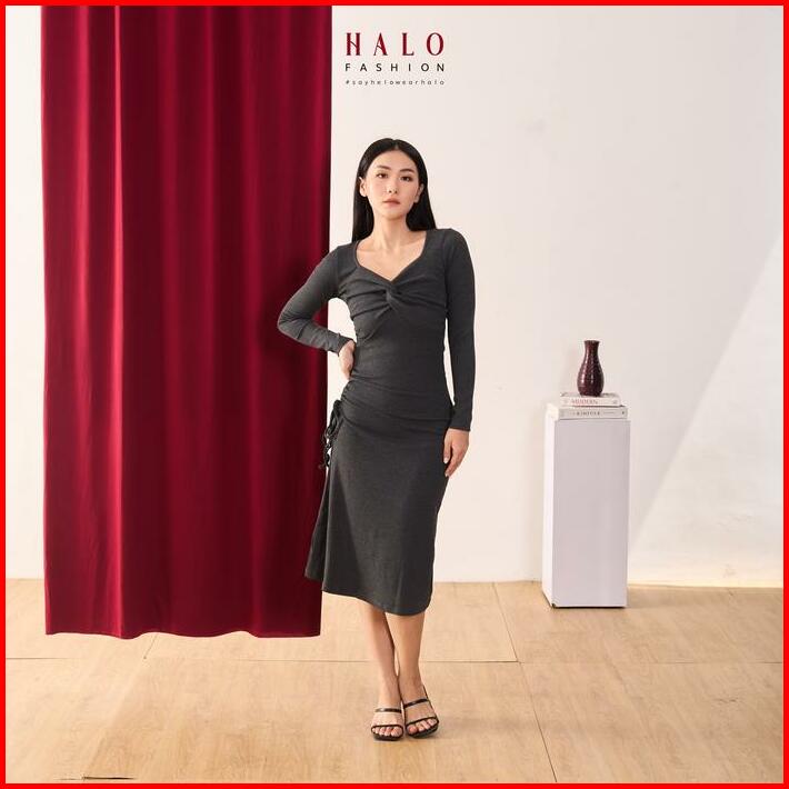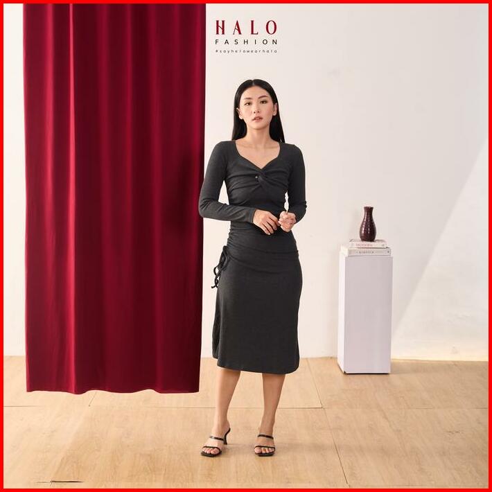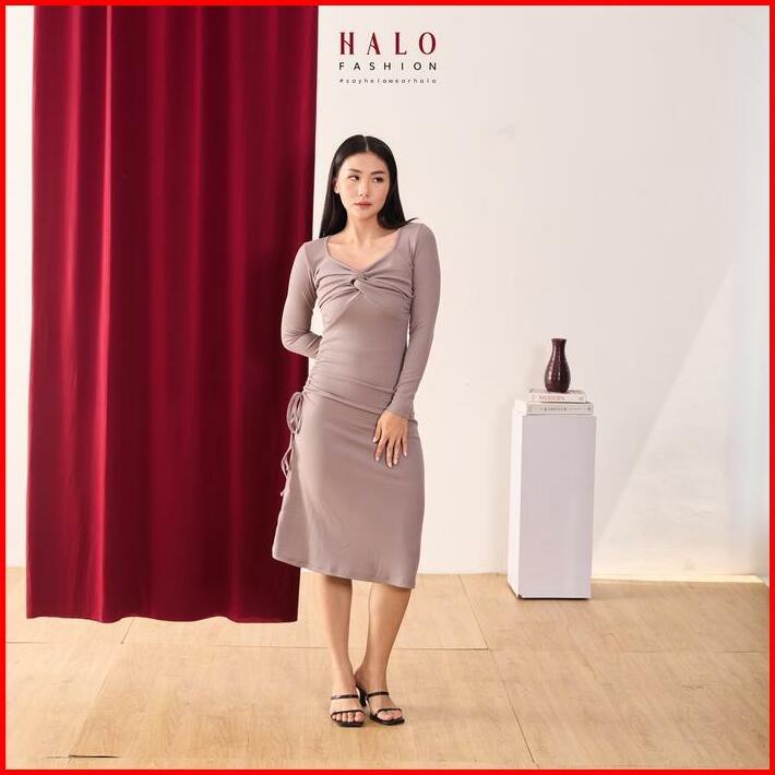 Halofashion Alila Midi Dress Basic Knit Slim Long Sleeve With Drawstring At The Waist Gaun Casual Wanita Simple