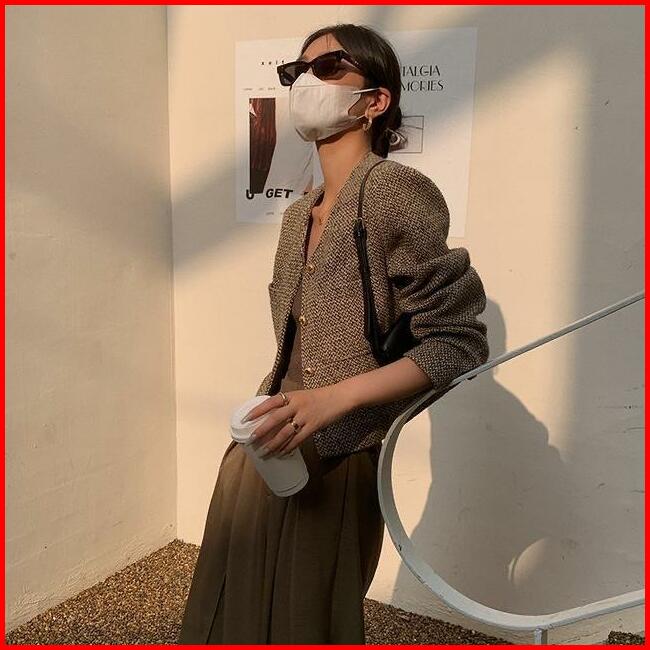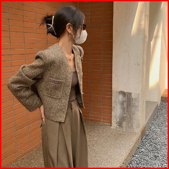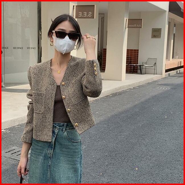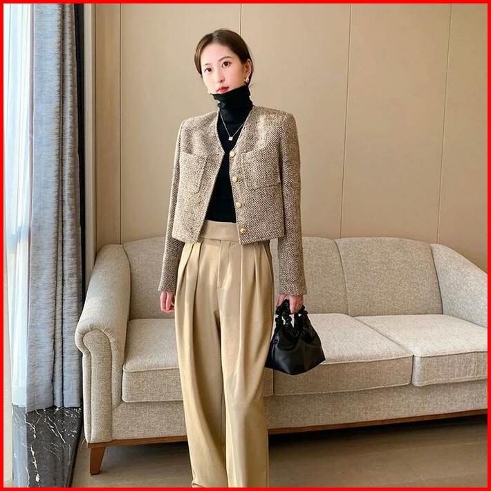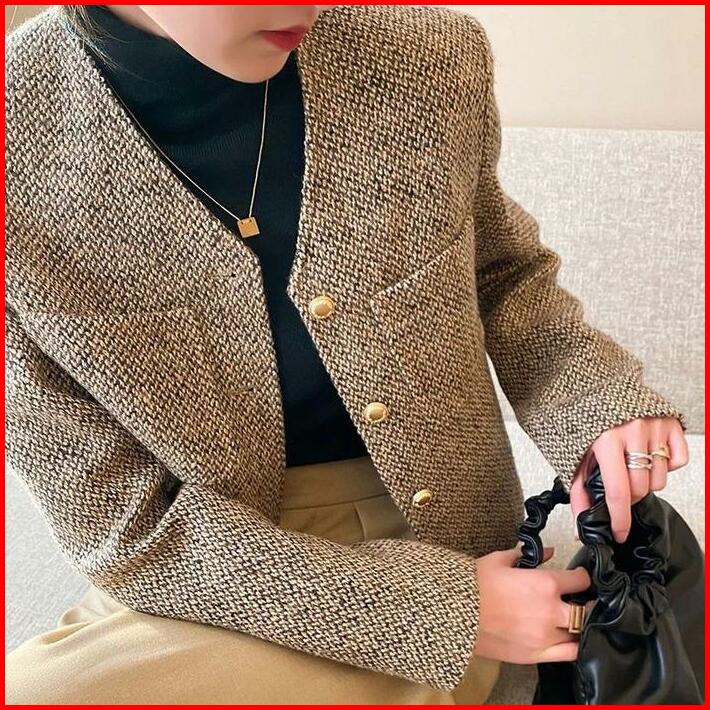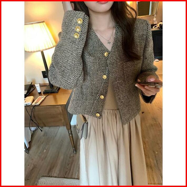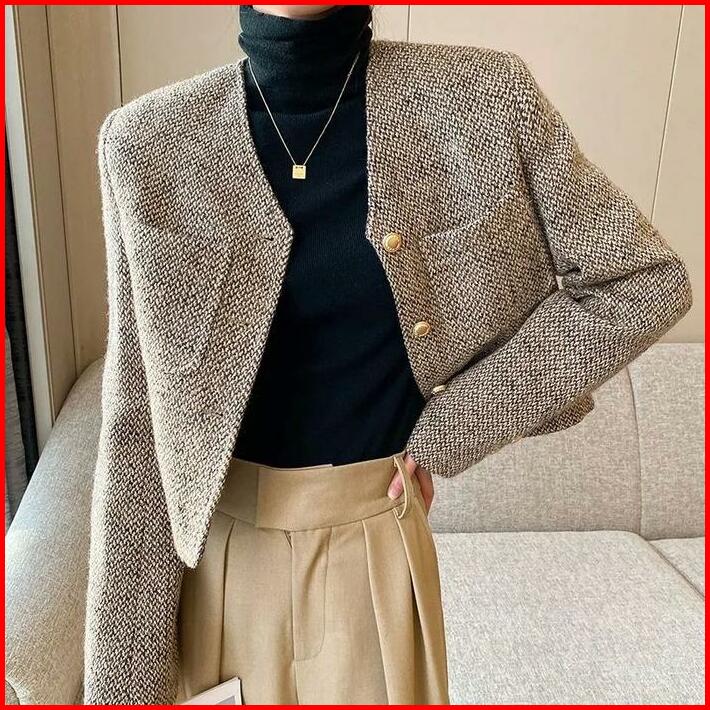 Blazer Casual Vintage Cokelat Tweed Wanita Cardigan Lengan Panjang Crop Top Jaket Bahan Nyaman Coksu M594