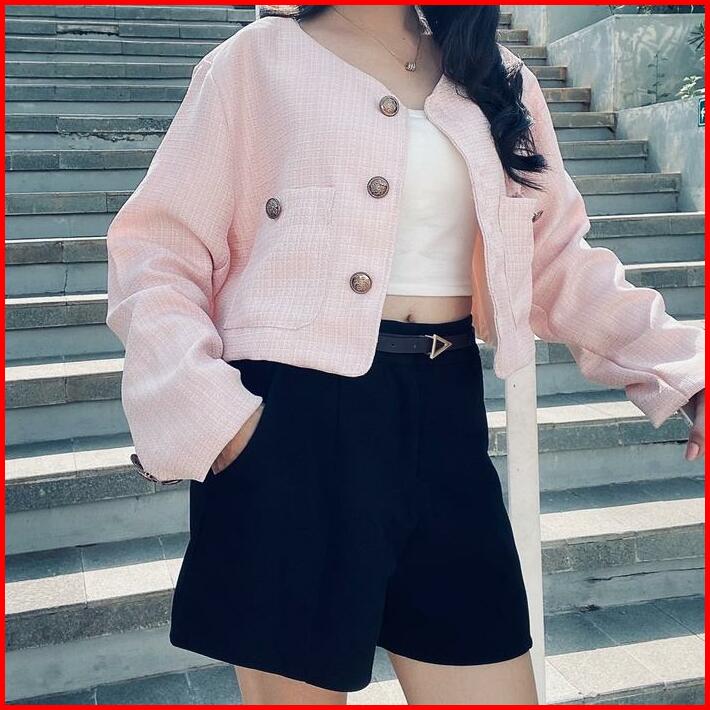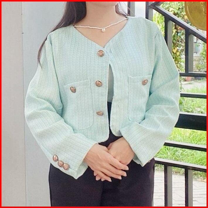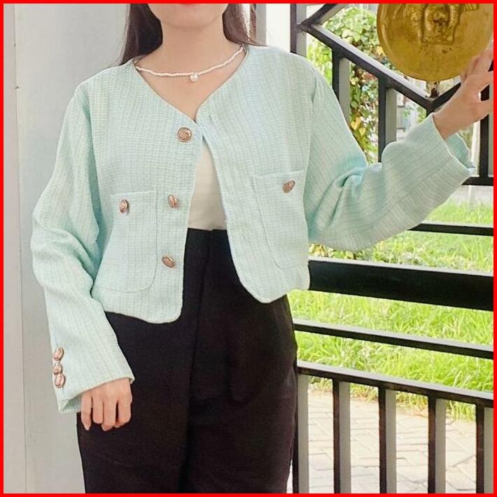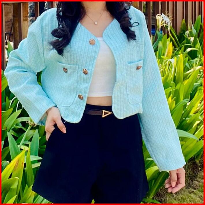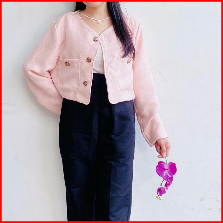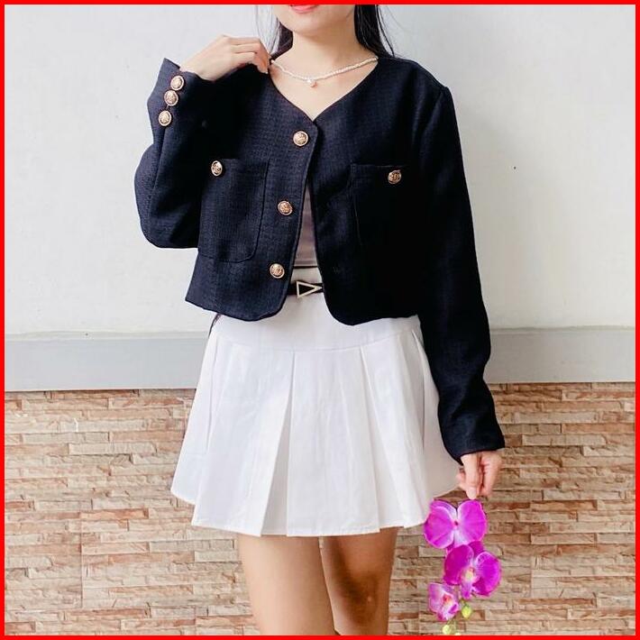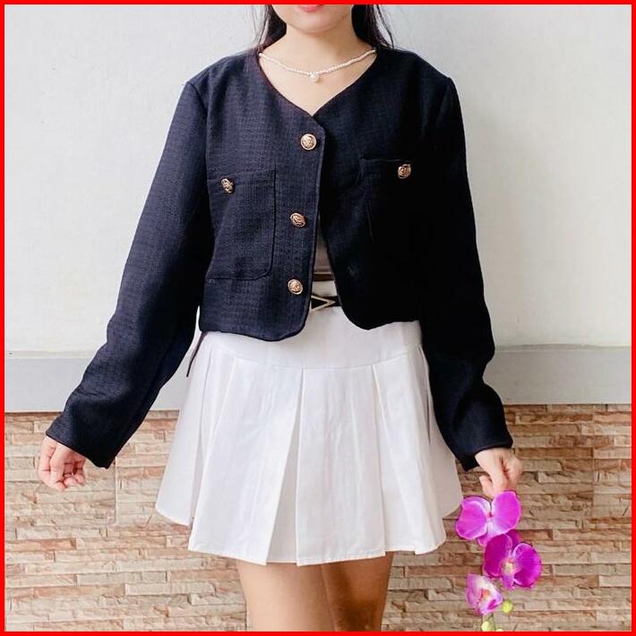 Lilam Blazer Keiry F Tweed Crop Full Furring Kantoran Outer Cardigan Terbaru Black Tangan Panjang Atasan Wanita Jaket Bl