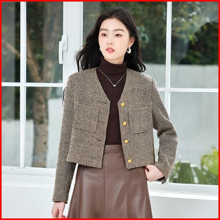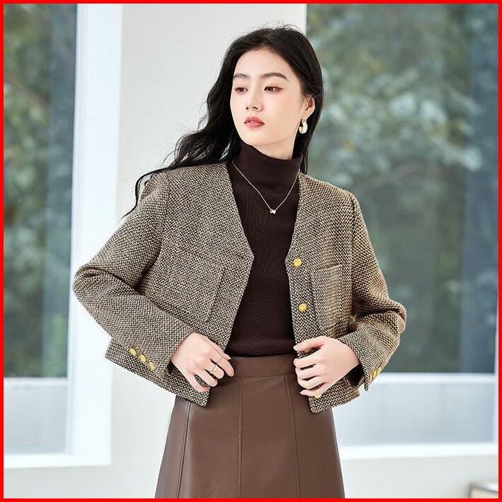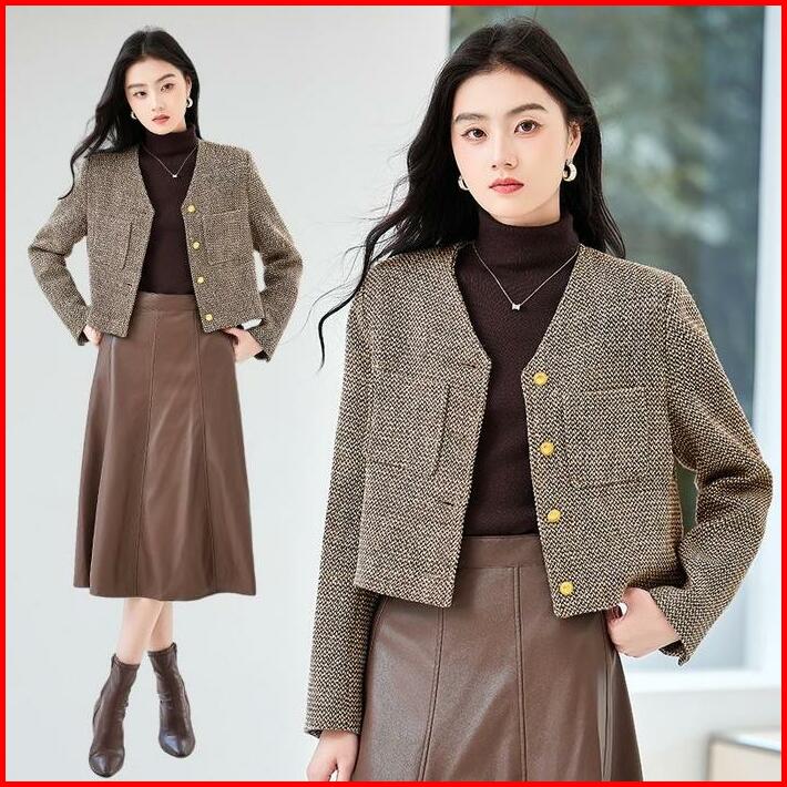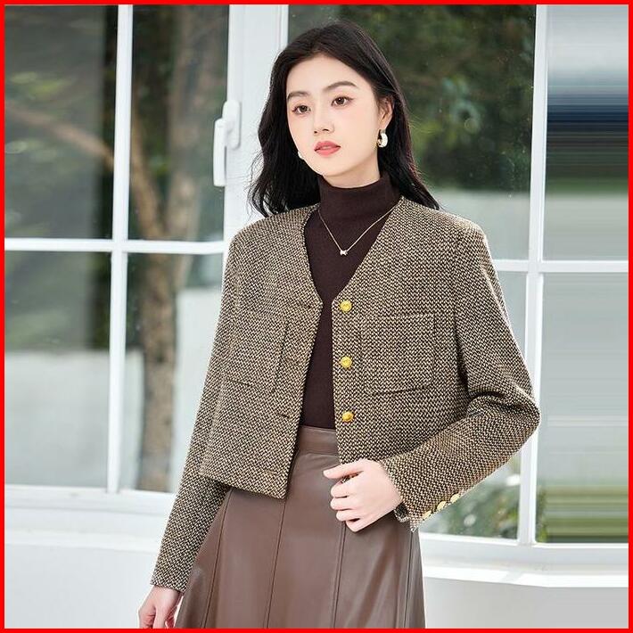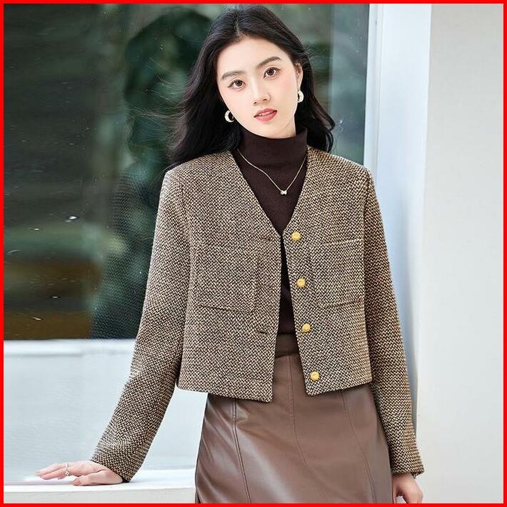 Blazer Wanita Retro Blazer Korea Tweed Cardigan Crop Coklat Blazer Nyaman Autumn Blazer Korea Women Jaket Atasan Wanita
