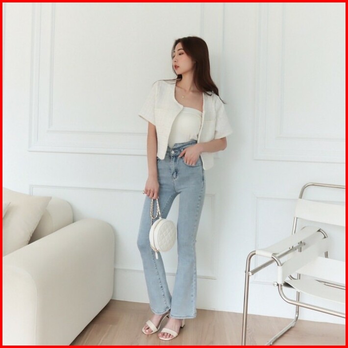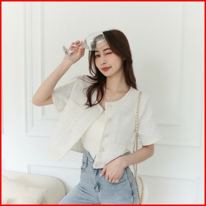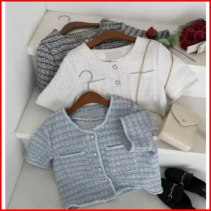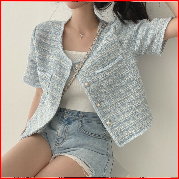 Mon Korean Tweed Blazer Biru Putuh Hitam Lengan Pendek Wanita Premium