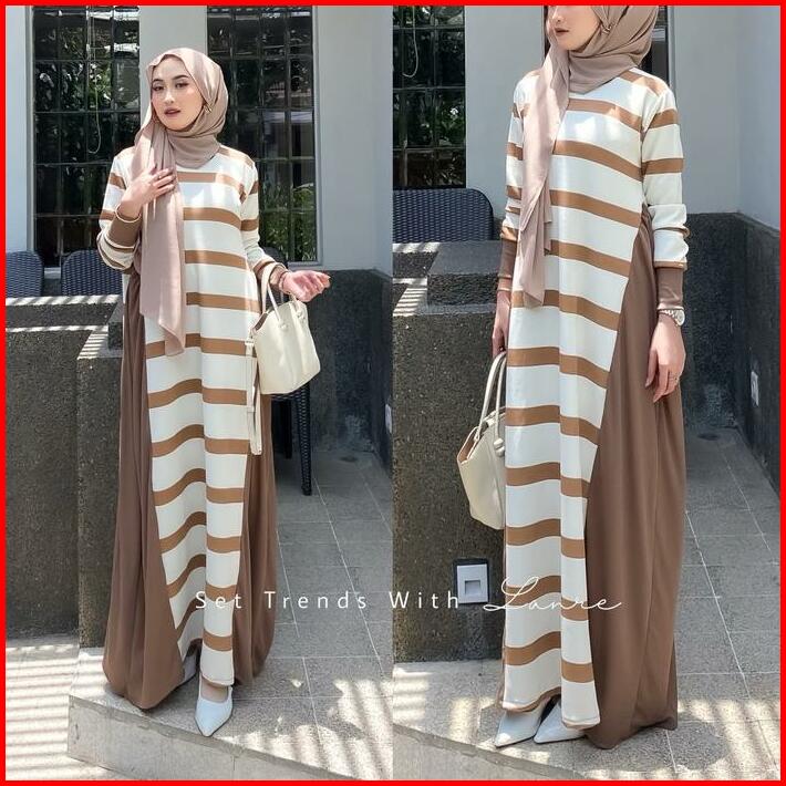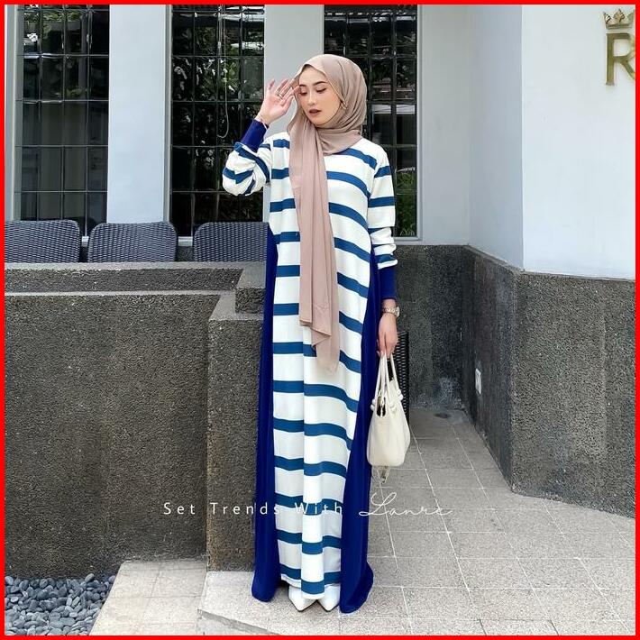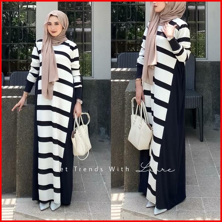 Viona Dress Motif Strip Hitam By Lanre Gamis Dengan Kesan Anggun Berbahan Knit Lembut Cantik Muslim Nyaman Wanita Formal