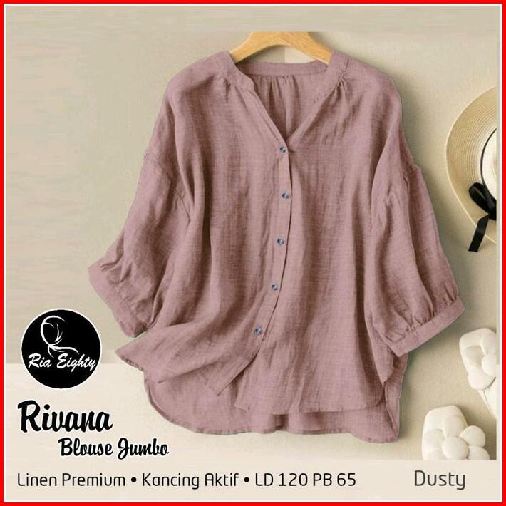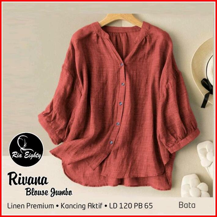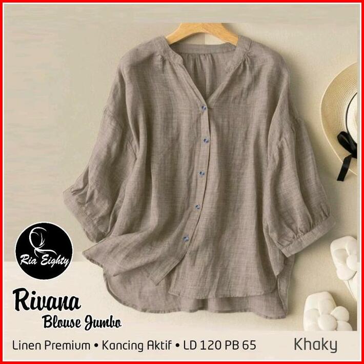 Kemeja Rivana Atasan Wanita Kerah Shanghai Lengan 3 4 Bahan Polo Linen Kancing Full Oversize