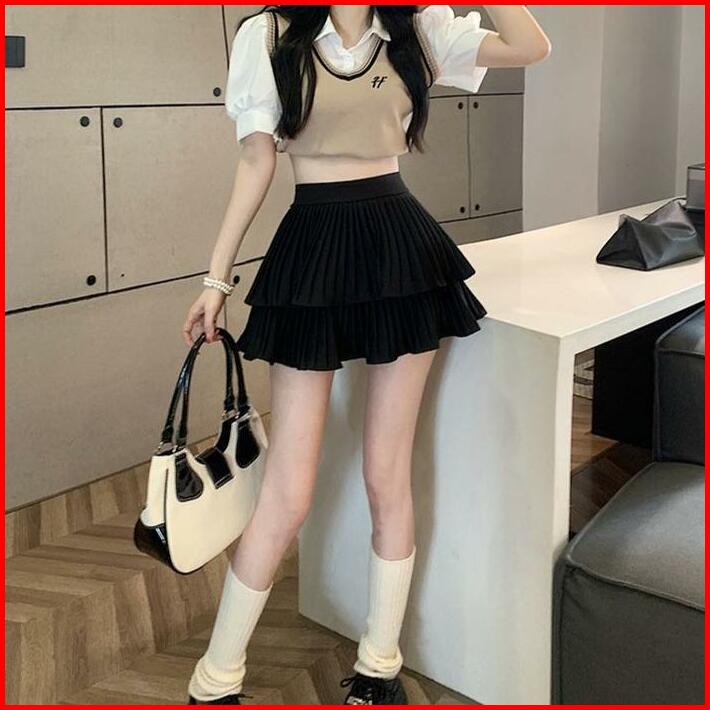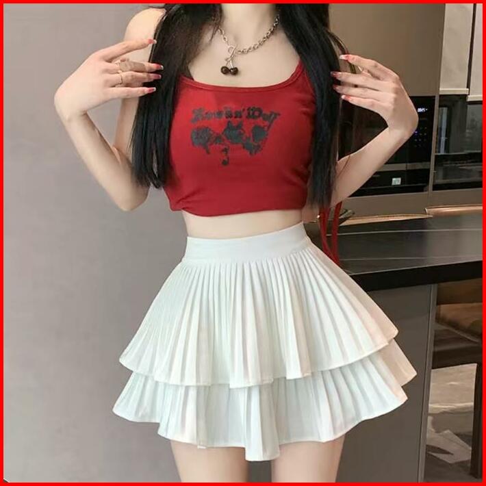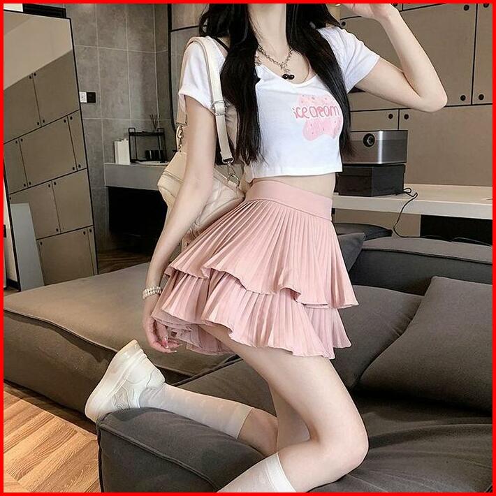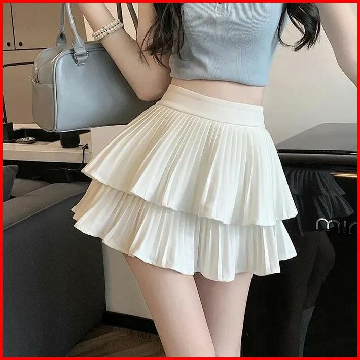 Spice Girl Lapisan Ganda Lipit Rok Rok A-line Pinggang Tinggi Elastis Hitam Merah Panjang Pendek Putih Wanita Mini
