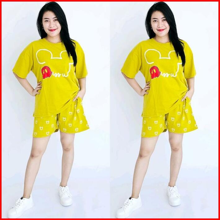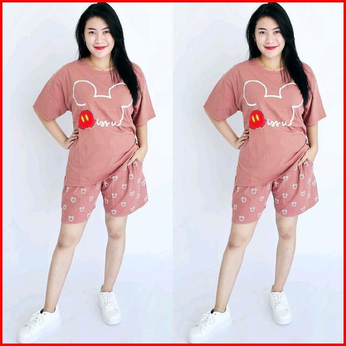 Setelan Wanita Oversize All Size Lengan Pendek Saku Kanan Kiri Katun Kombed 30s Tebal Kekinian Motif Lucu One Set Jumbo