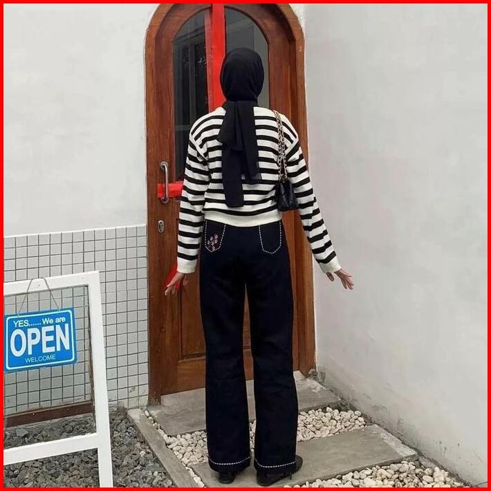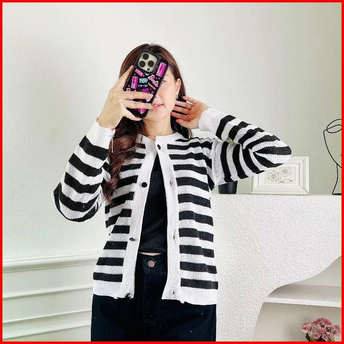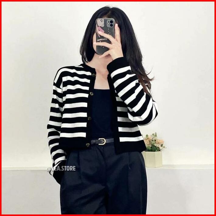 Moura Cardigan Rajut Crop Stripe Korea Style Motif Garis Kardigan Wanita Knite Kancing Kerah Nyaman Panjang Knitwear Ata