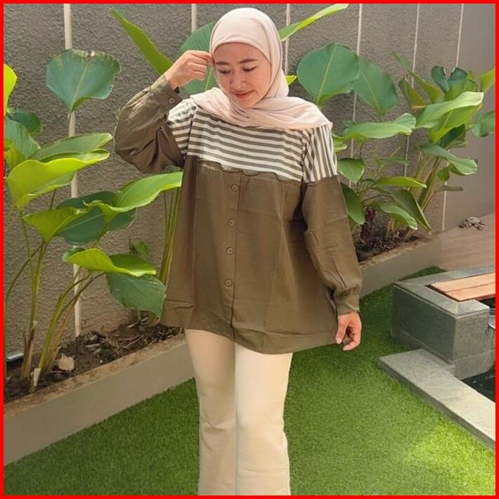Fania Blouse Strip Rayon Knit Atasan Wanita Lengan Panjang Kombinasi Baju Cewek Casual Dewasa Katun Remaja Muslim Shakil