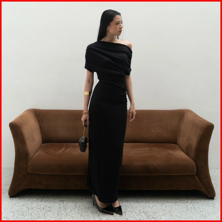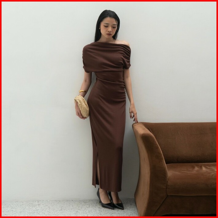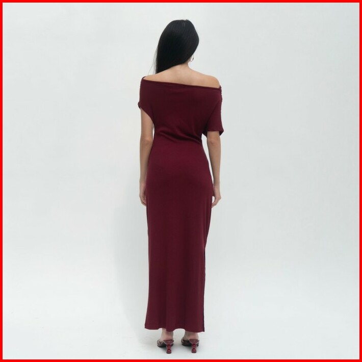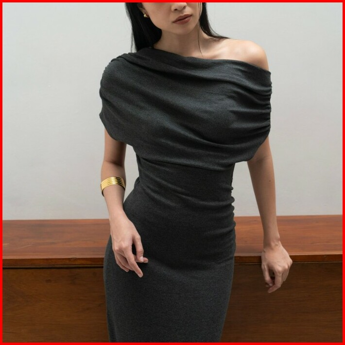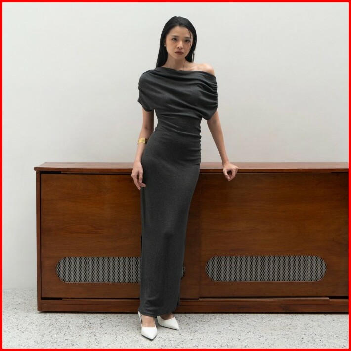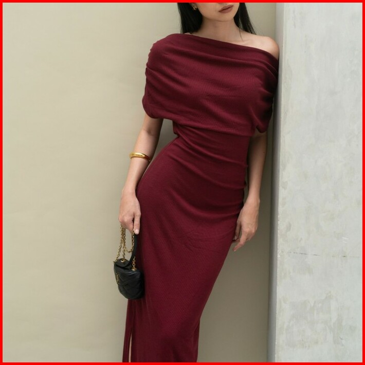 Pamela Dress Rooha Dress Panjang Wanita Off Shoulder Ribbed Knit Terusan Maxi Sabrina Dress Korean Long Dress