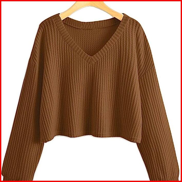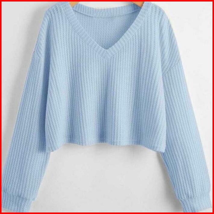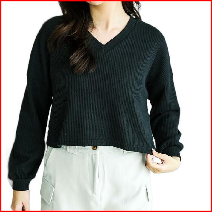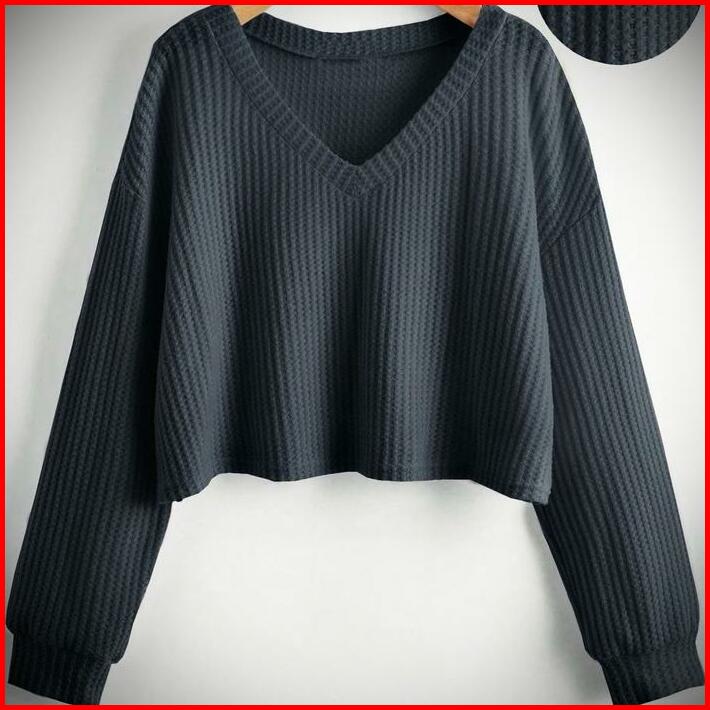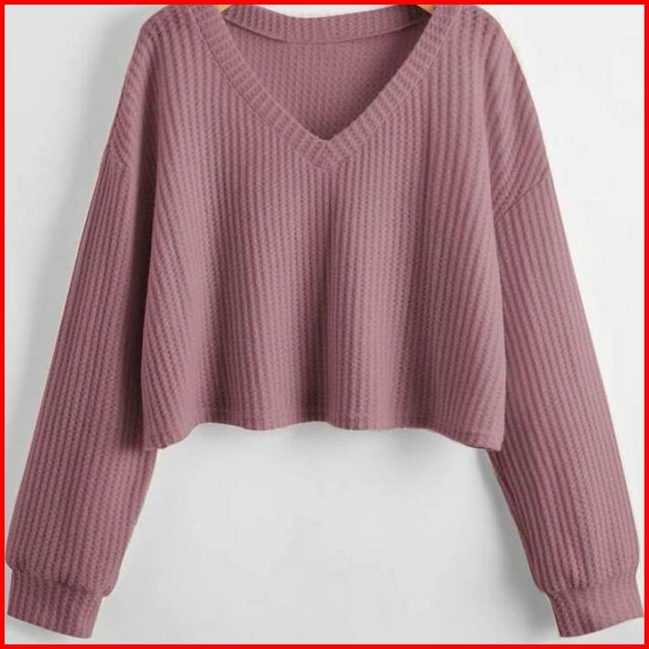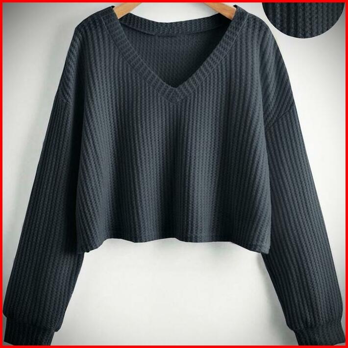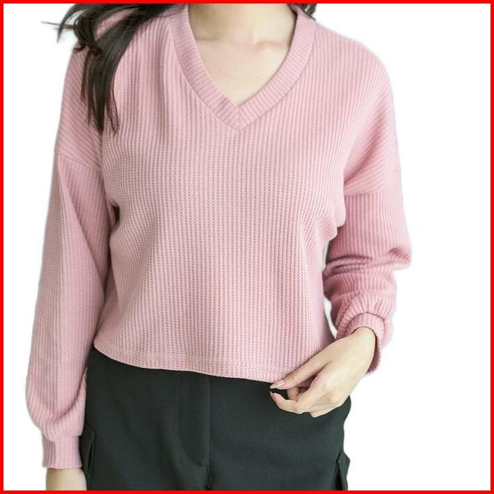 Sweater Blouse Crop V-neck Rajut Waffle Oversize Wanita Kekinian