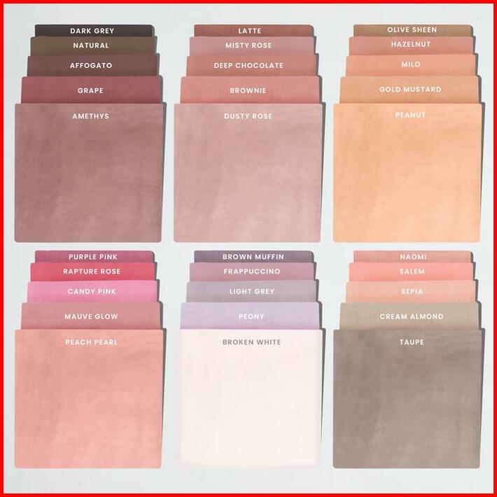 ARMY, BROWN SUGAR, BURGUNDY, CHOCO DUSTY, CREAMY, DARK GREY, DUSTY PURPLE, LIGHT GREY, MAROON, MAUVE GLOW, MILO, MUSTARD, OLIVE, PEACH PEARL, STONE GREY, TAN, HAZELNUT, COFFEE, DARK MUSTARD, DUSTY PINK, SAGE, SILVER, NATURAL, BLACK, CREAM ALMOND, NAVY, PEONY, OLIVE SHEEN, BROKEN WHITE, NUDE, DENIM, BROWN MUFFIN, RAPTURE ROSE, CADET, LAVENDER, SPARROW, PURPLE PINK, TAUPE, FRAPPUCCINO, BROWNIE, CANDY PINK, GREY, SOFT BEIGE, SOFT ZAITUN, PEANUT, DARK CHOCO, GREEN PASTEL, ORCHID, DUSTY ROSE, MISTY ROSE, YELLOW CREAM, LILY GREEN, AFFOGATO, PANCAKE, CORAL BLUE, CHARCOAL, MILKTEA, MULBERRY, SOFT PEACH, SOFT PURPLE, CINNAMON, SOFT JEANS, DEEP ARMY, PINK BLUSH, PINK PASTEL, DARK GREEN, CREAMY LIGHT GREY, TARO, CLOUDY GREY