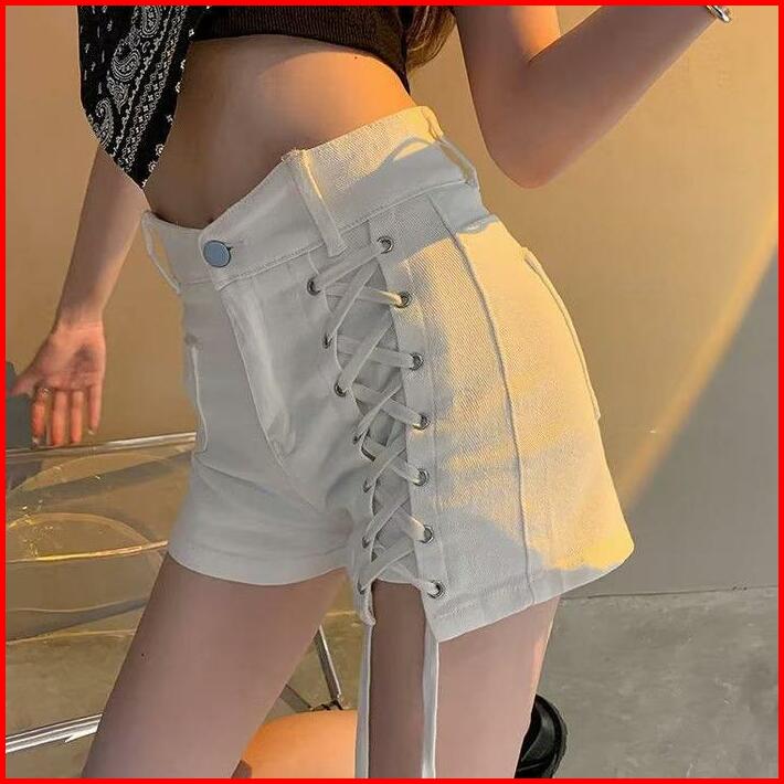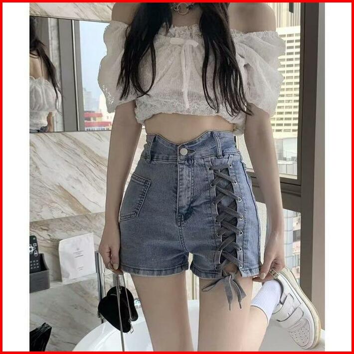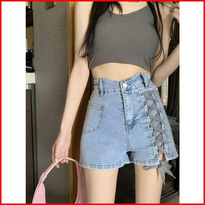 Celana Pendek Denim Slim Fit Wanita Korea Style Motif Ikat Tali Samping