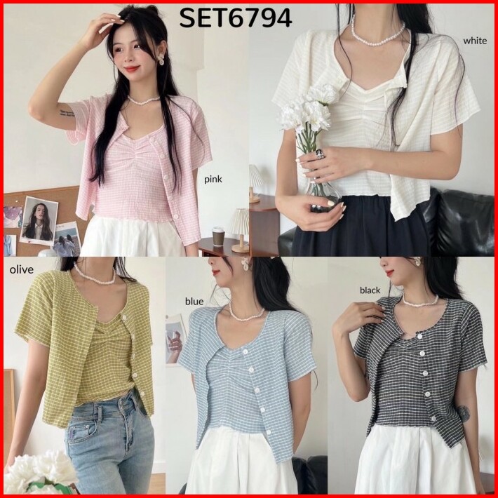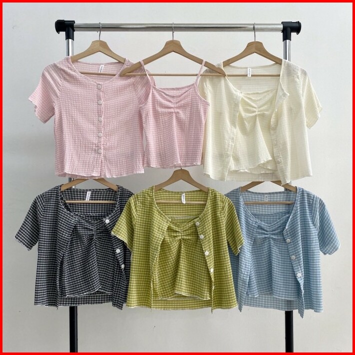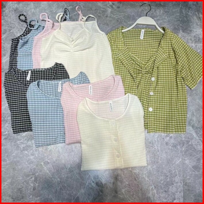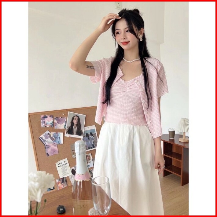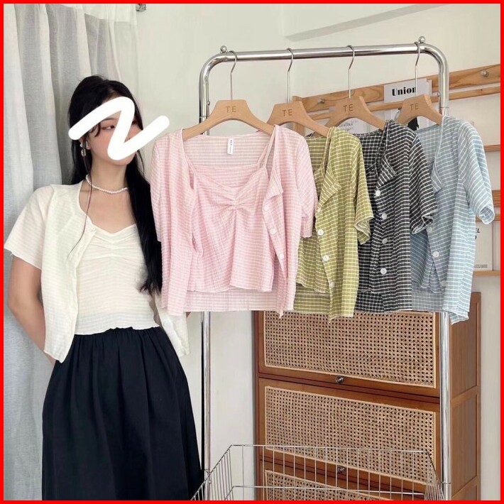 Set Wrinkled Cardigan Tanktop Korea Lengan Pendek Cute Pastel