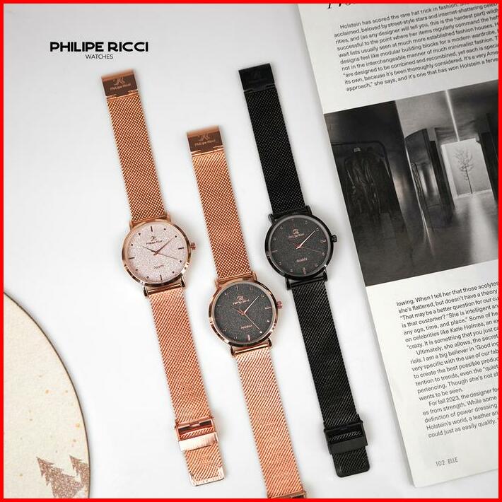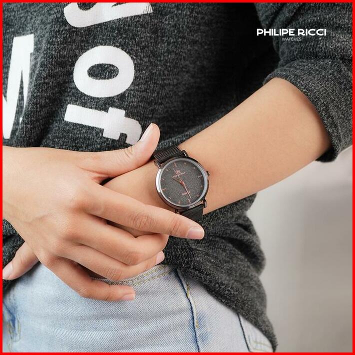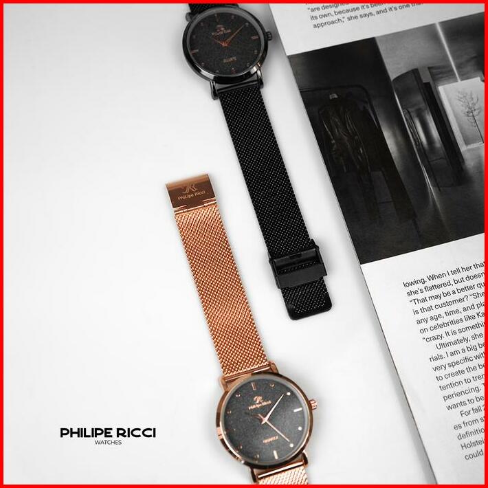 Philipe Ricci Jam Tangan Wanita Rantai Pasir Bulat Tipis Desain Kekinian 7488 Jam Cewek Rose Hitam