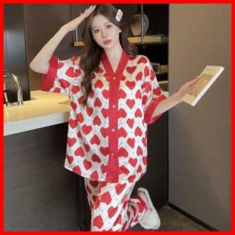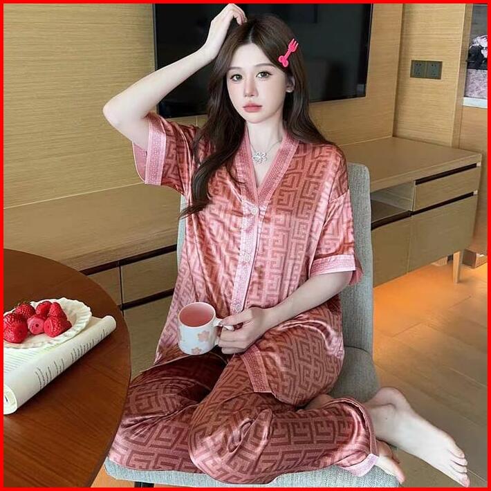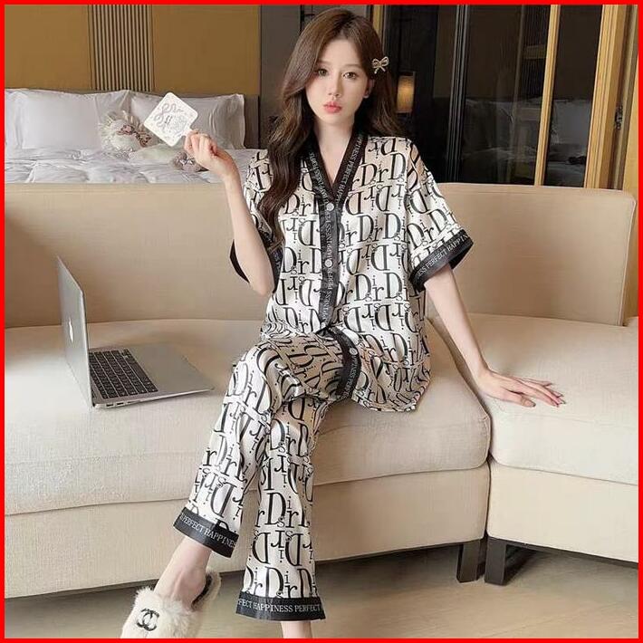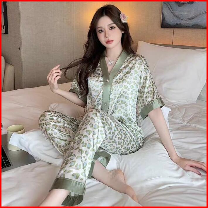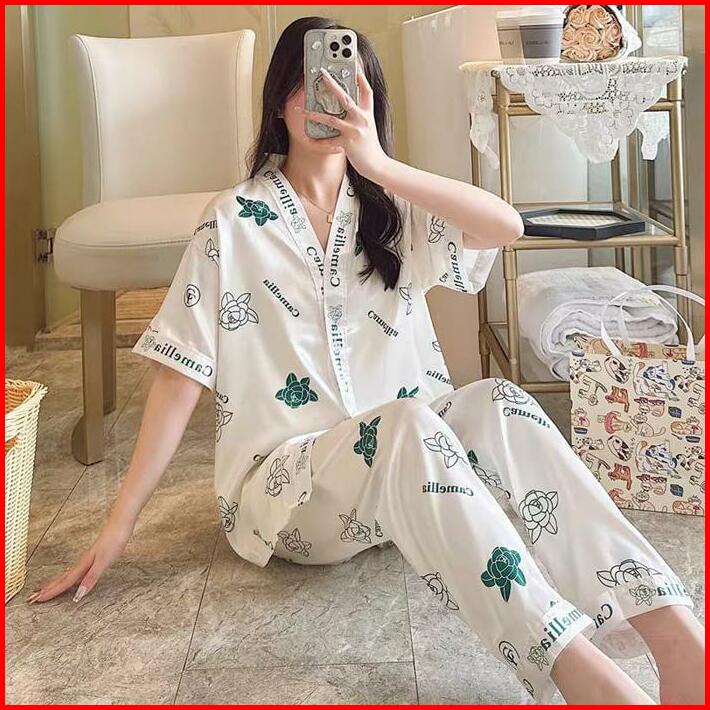 Stelan Baju Tidur Piyama Motif Lengan Pendek Celana Panjang Kekinian Baju Tidur Satin Wanita Set Piyama Pakaian Tidur