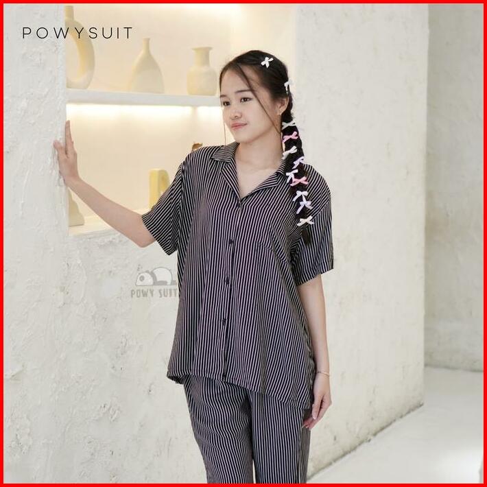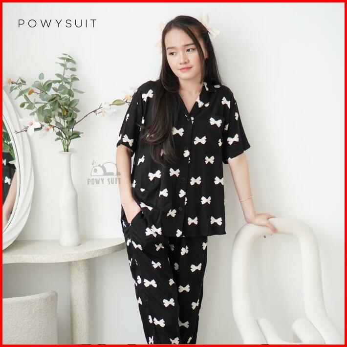 Powysuit Piyama Rayon Wanita Motif Lengan Pendek Dan Setelan Celana Panjang