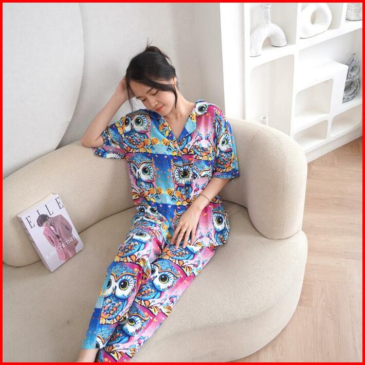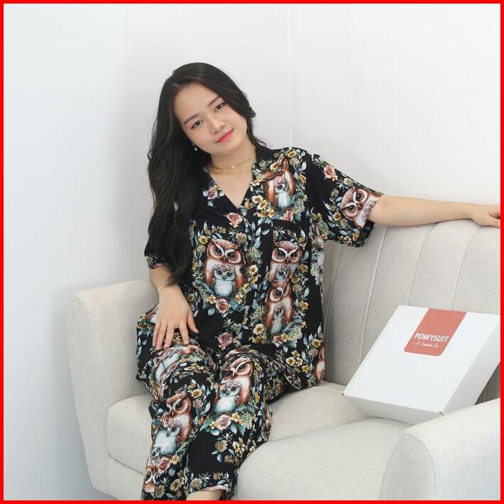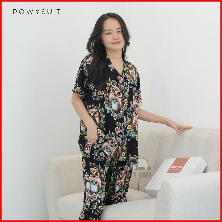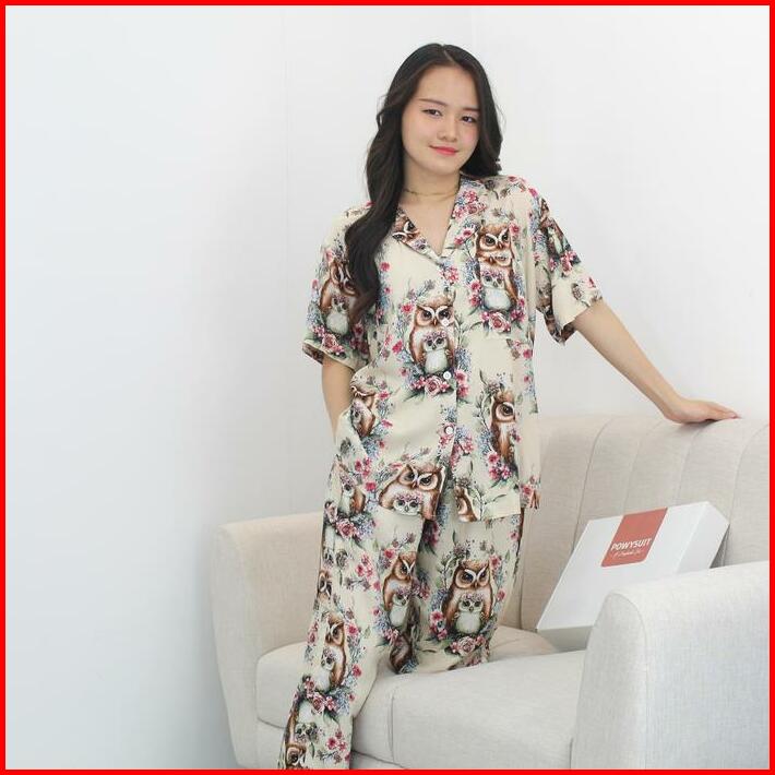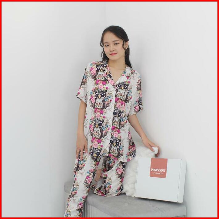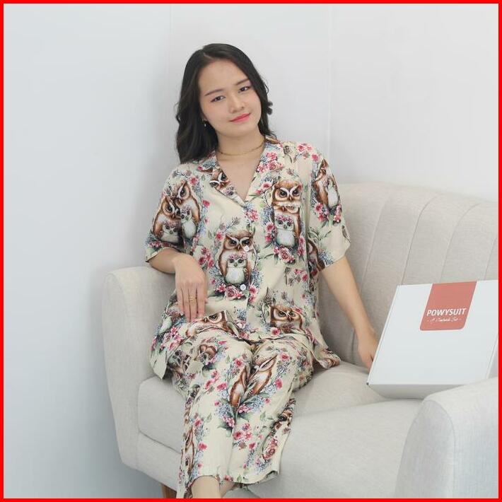 Powysuit Piyama Rayon Owl Wanita Motif Lengan Pendek Dan Setelan Celana Panjang