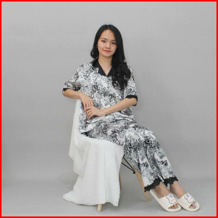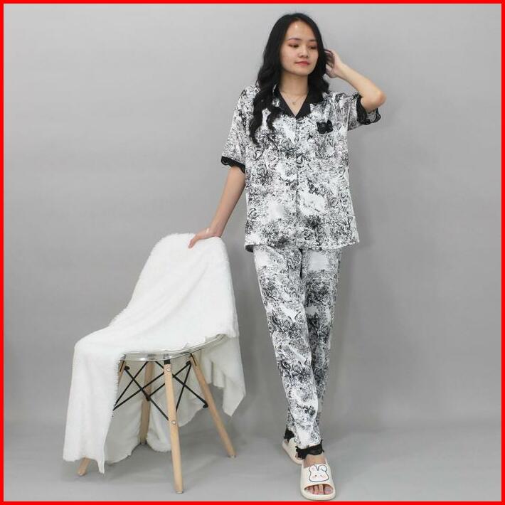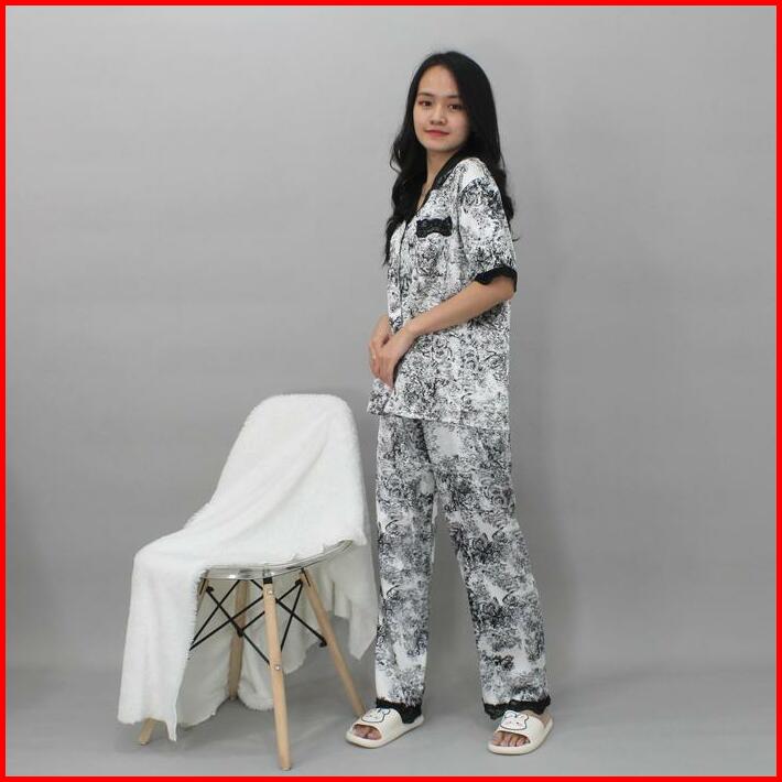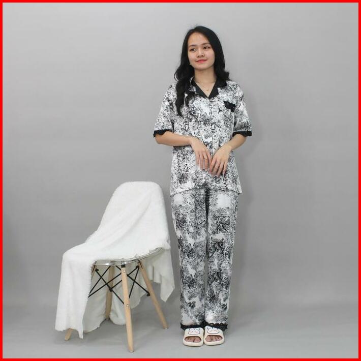 St20 Viera Piyama Motif Hitam Putih Bahan Satin Lengan Pendek Celana Panjang Baju Tidur Wanita Dewasa Setelan Fit Lembut