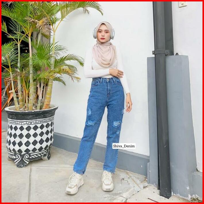 Celana Jeans Cewek Pinggang Tinggi Boyfriend Sobek Highwaist Loose Kulot Panjang Boyfie Devira Ripped Premium Quality De