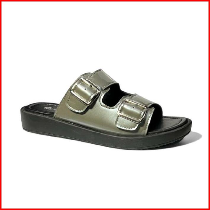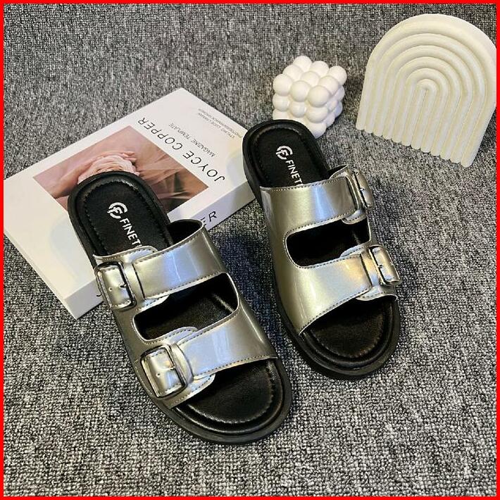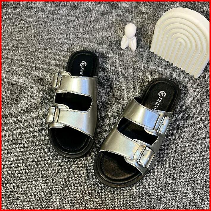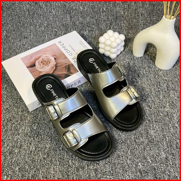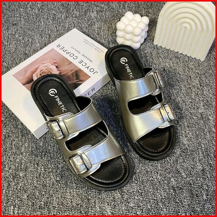 Finetic Sandal Wanita Platform Kekinian Simple Eleghan Silver Glossy Shoes Selop Karet