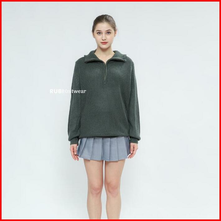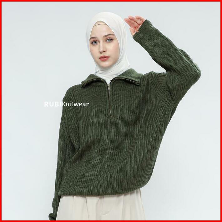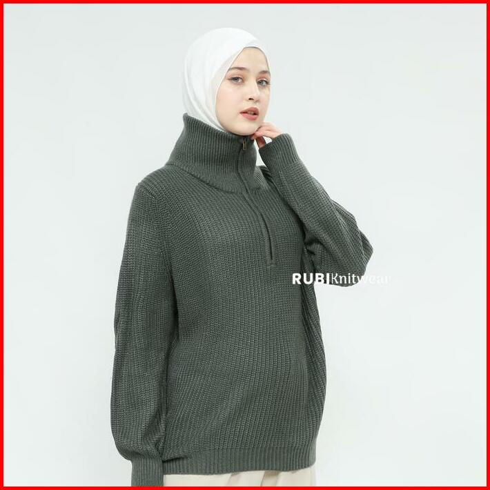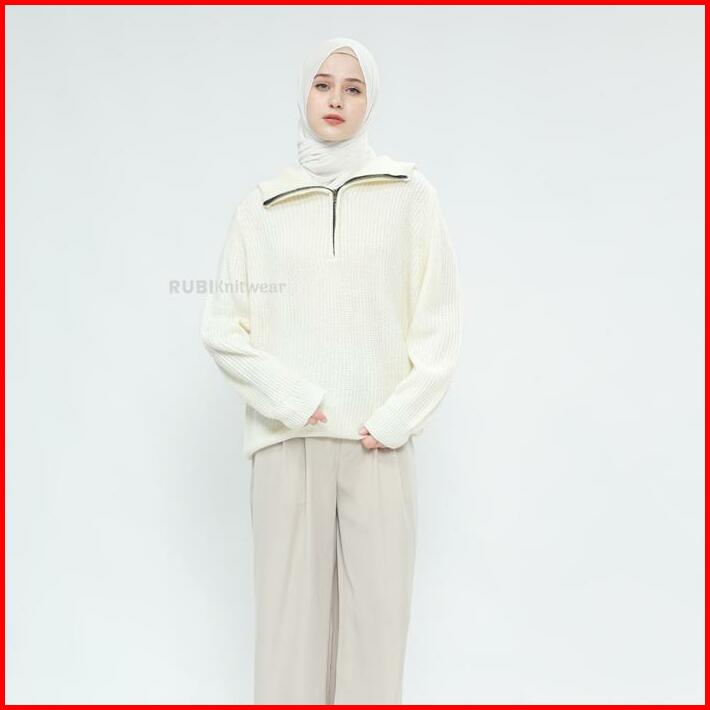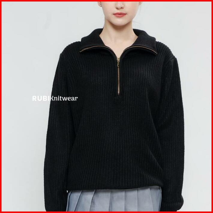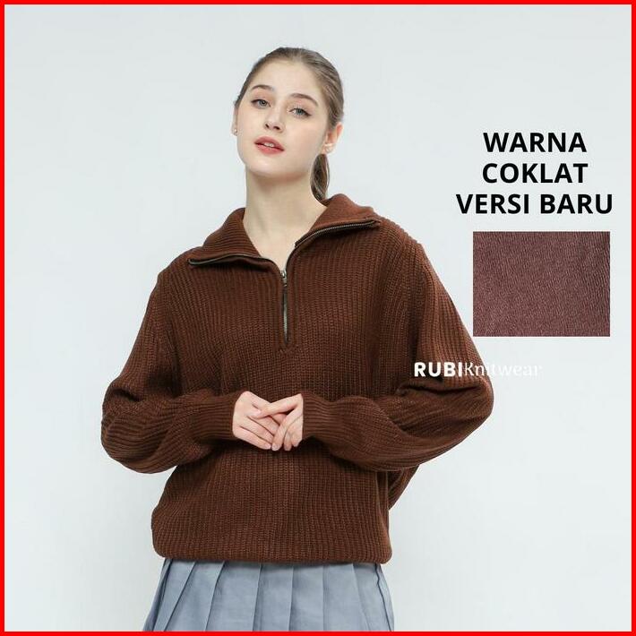 Rubi Cori Sweater Atasan Knit Polos Zipper Knitwear Wanita Top Outer Cewek Casual Baju Panjang Basic Tebal Crewneck Rib