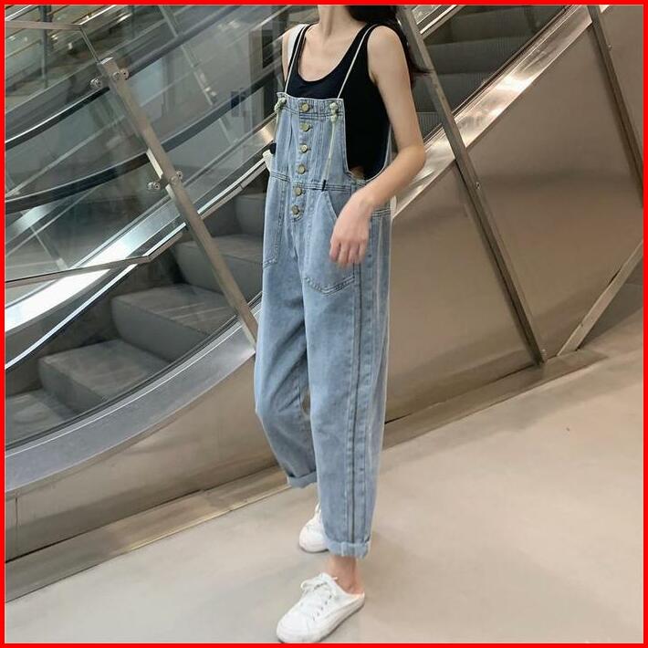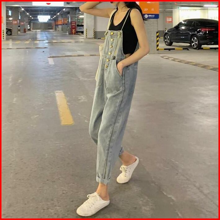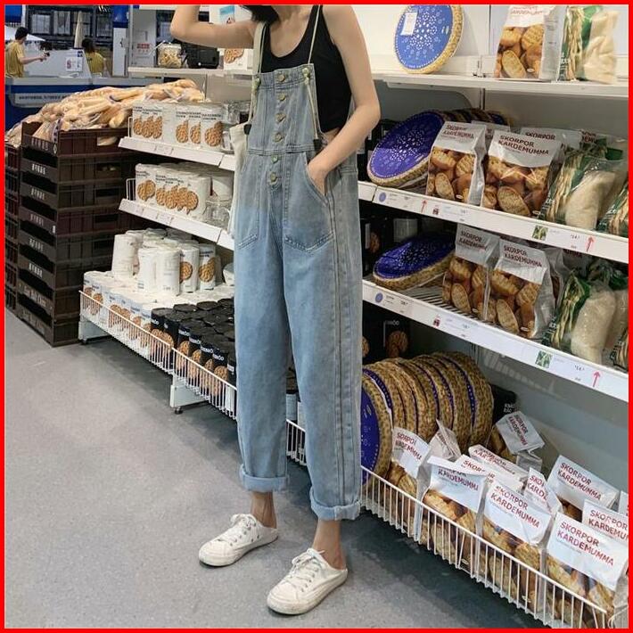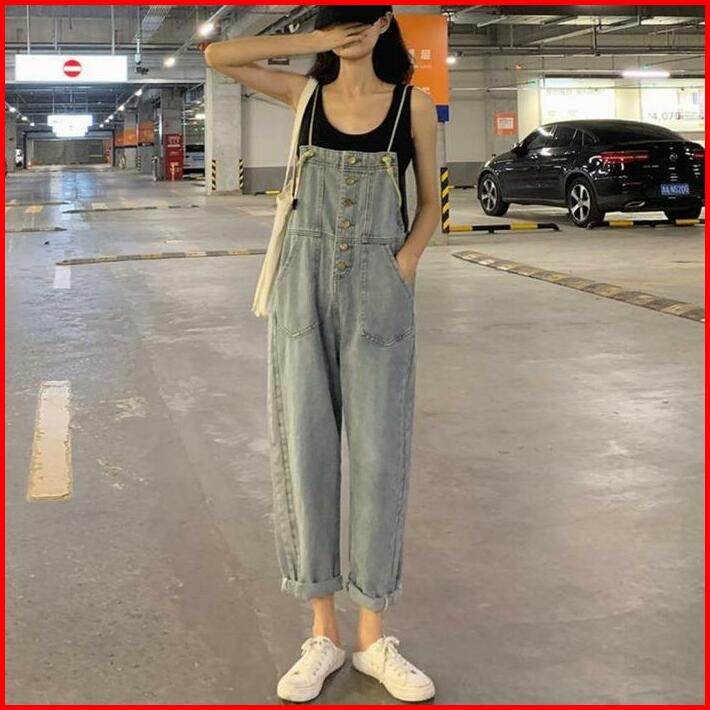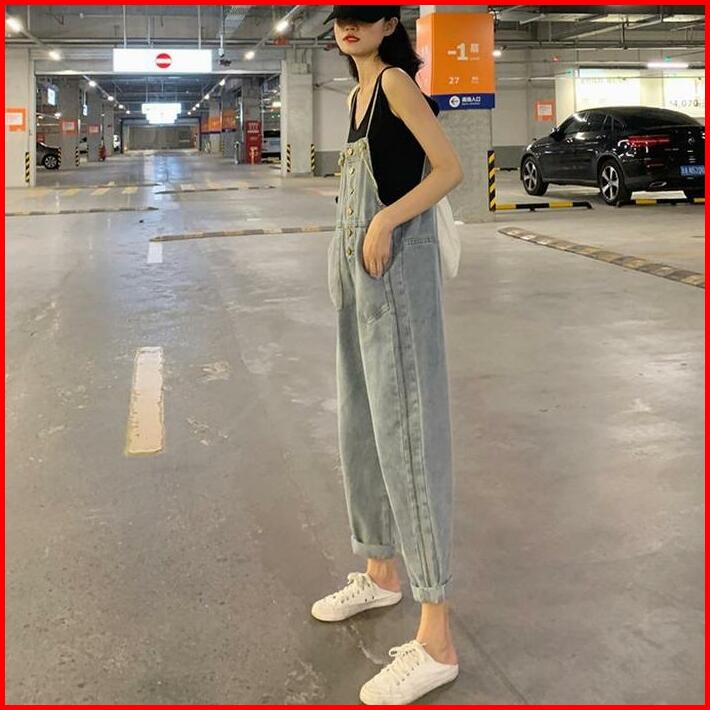 Xj0051 Overall Celana Kulot Denim Wanita Korea Jeans Kaki Biru Panjang High Waist Pendek Retro Straight Hitam Muda