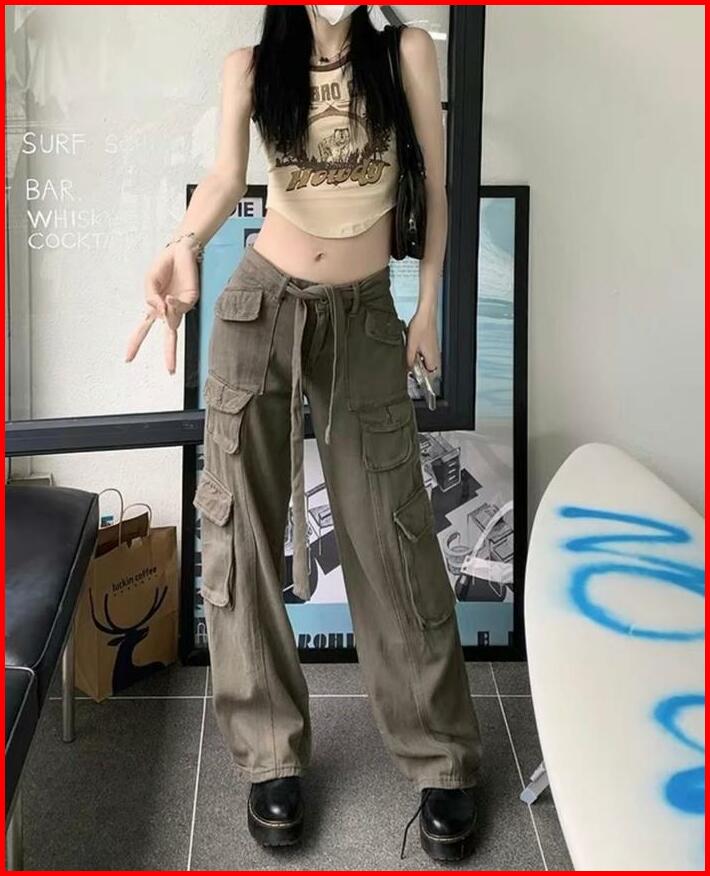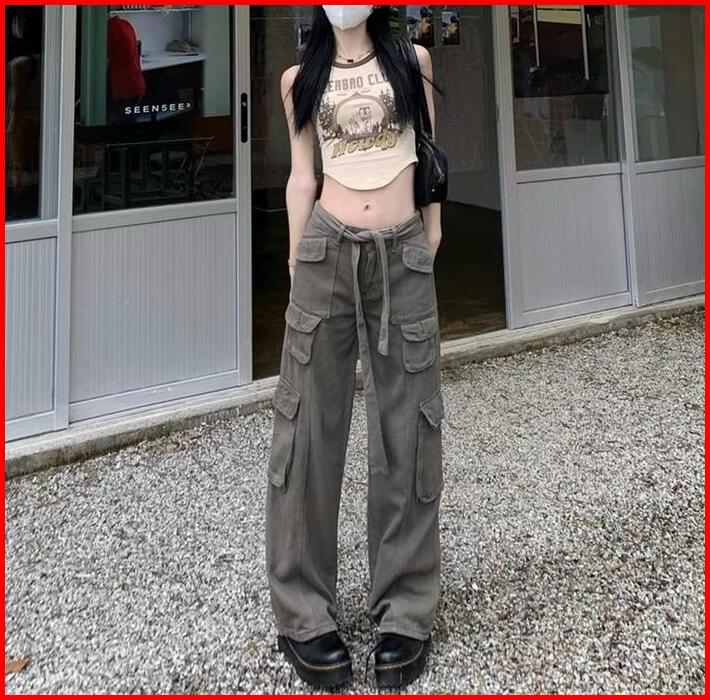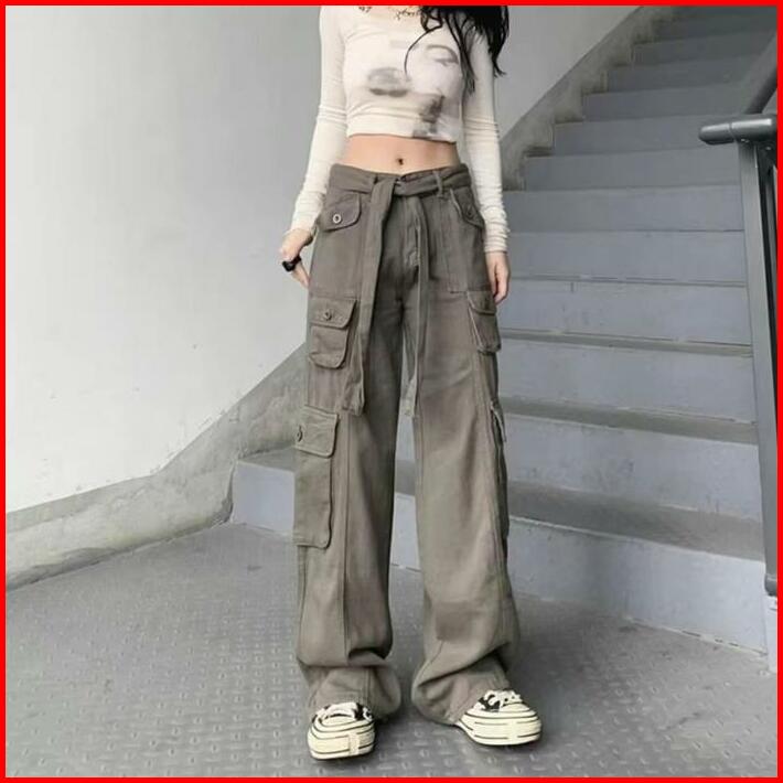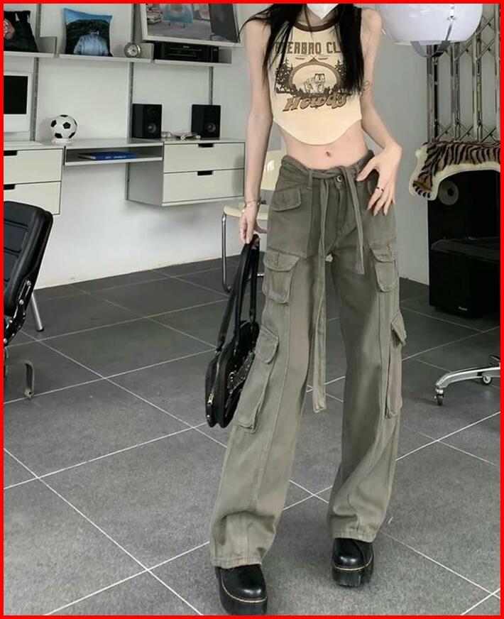 Unisex Celana Jeans Panjang Cargo Tali Hight Waist Loose Straight Cargo Jeans Panjang Retro Hitam Boyfriend Biru