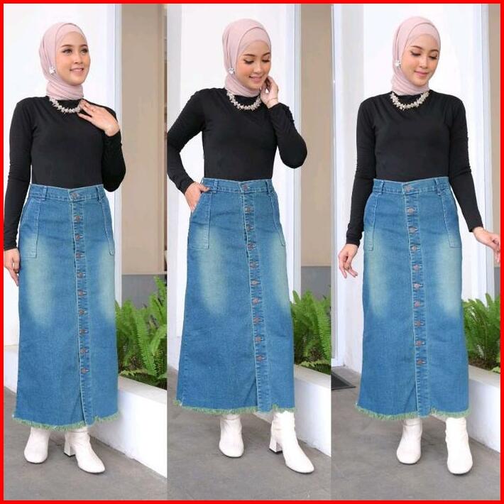 Rok Panjang Jeans Span Jumbo Full Kancing 29-39 Bigsize