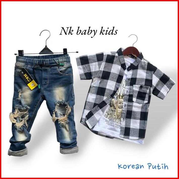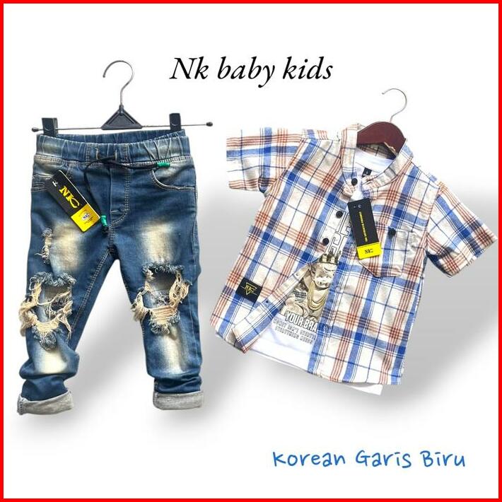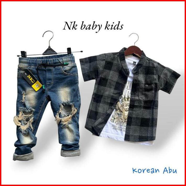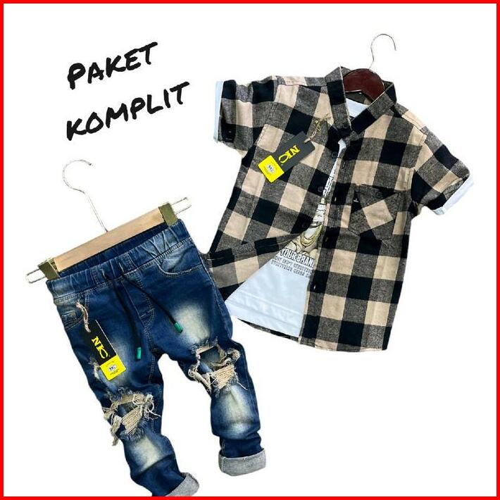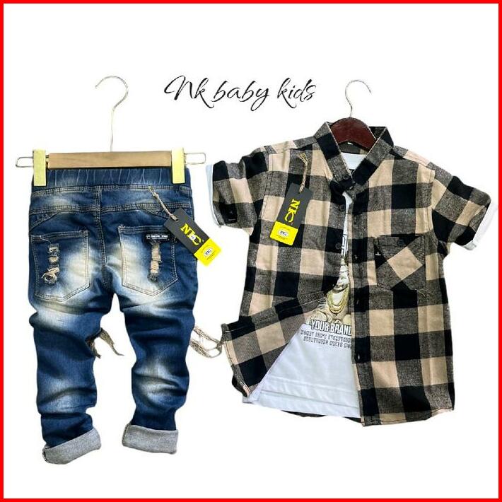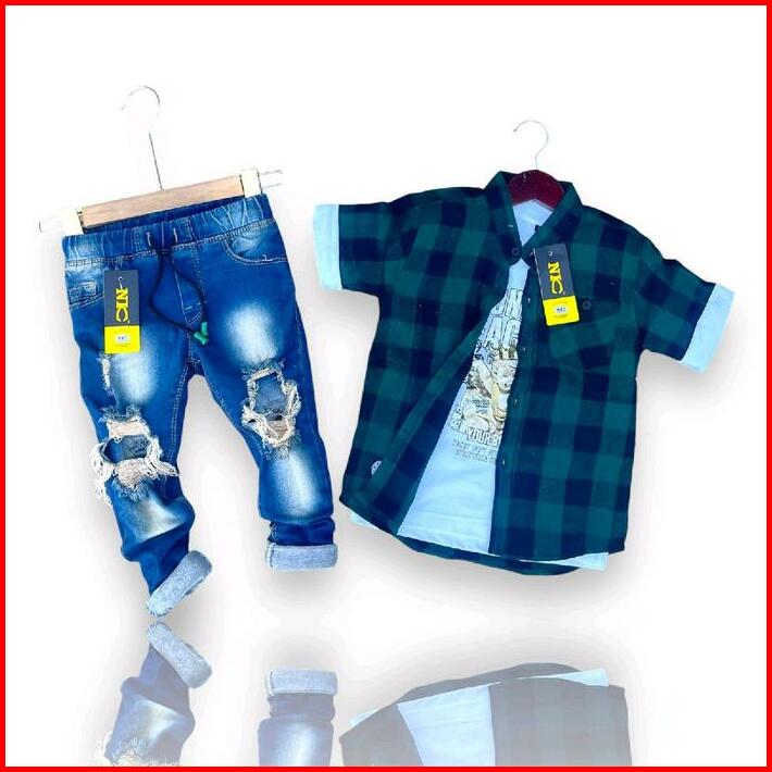 Stelan Jeans Anak Distro Usia 1-7 Tahun Stelan Anak Paket Komplit 3 Pcs Celana Jeans Kaos Kemeja Fashion