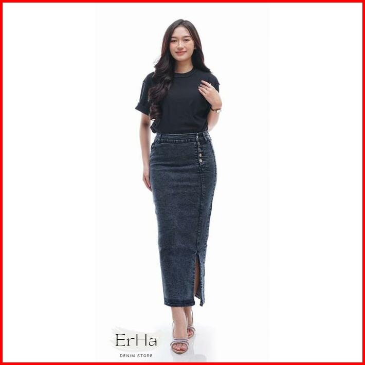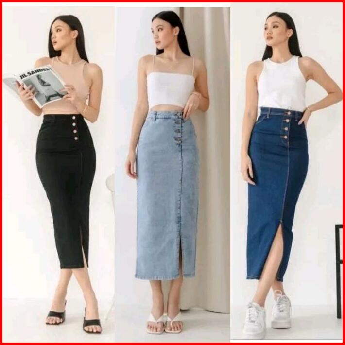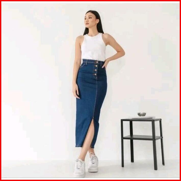 Rok Jeans Panjang Wanita Jumbo Rok Jeans Span Wanita Kancing 5 Model Belah Depan Rok Denim Wanita Stretch Cewek Rok Bela