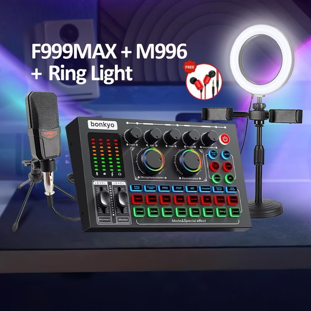 Bonkyo Sound card F999MAX + mikrofon tripod M996 + lampu pengisi, set lengkap peralatan siaran langsung, pembawa acara