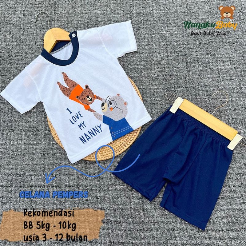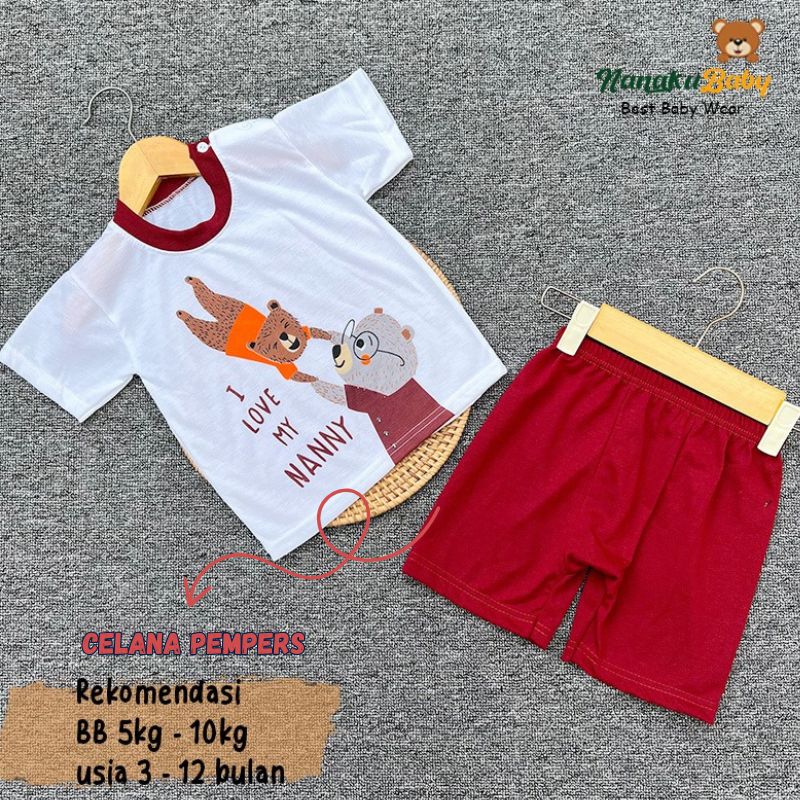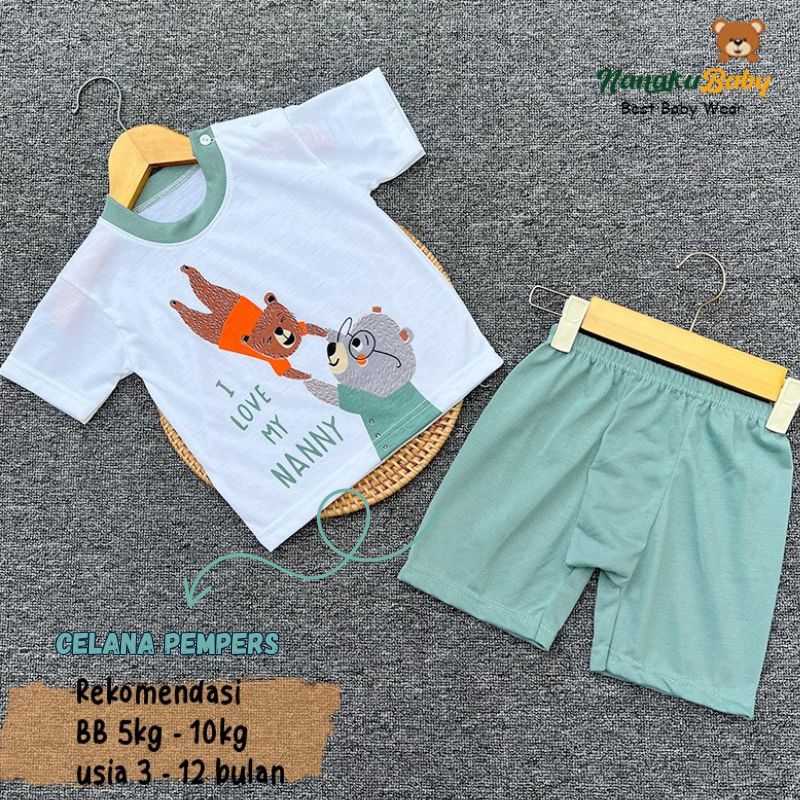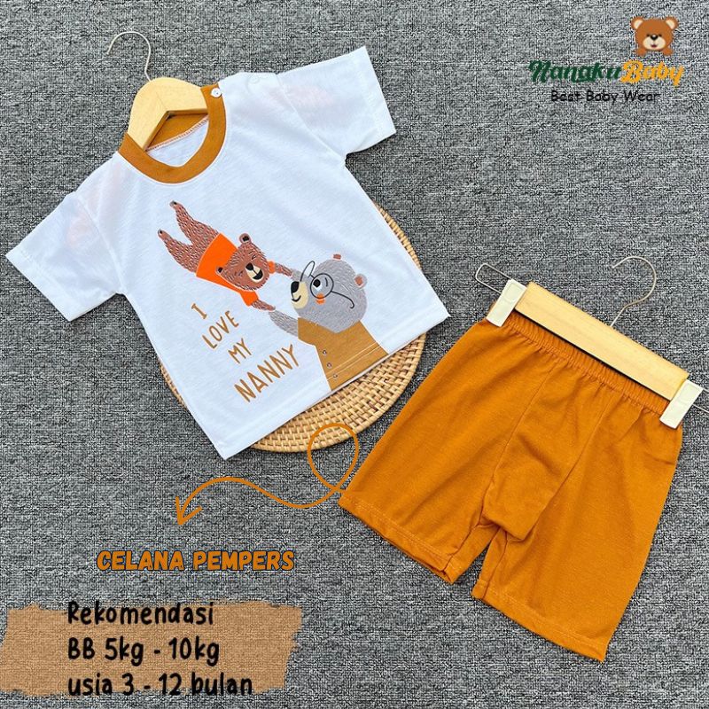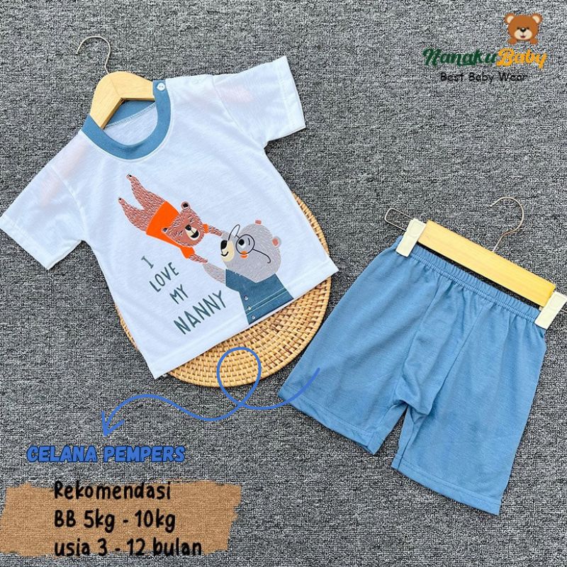 Nanaku Baby Setelan Baju Bayi Unisex Model Lengan Pendek Celana Pempers Pendek Usia 3-12 Bulan Motif Beruang Grizzly